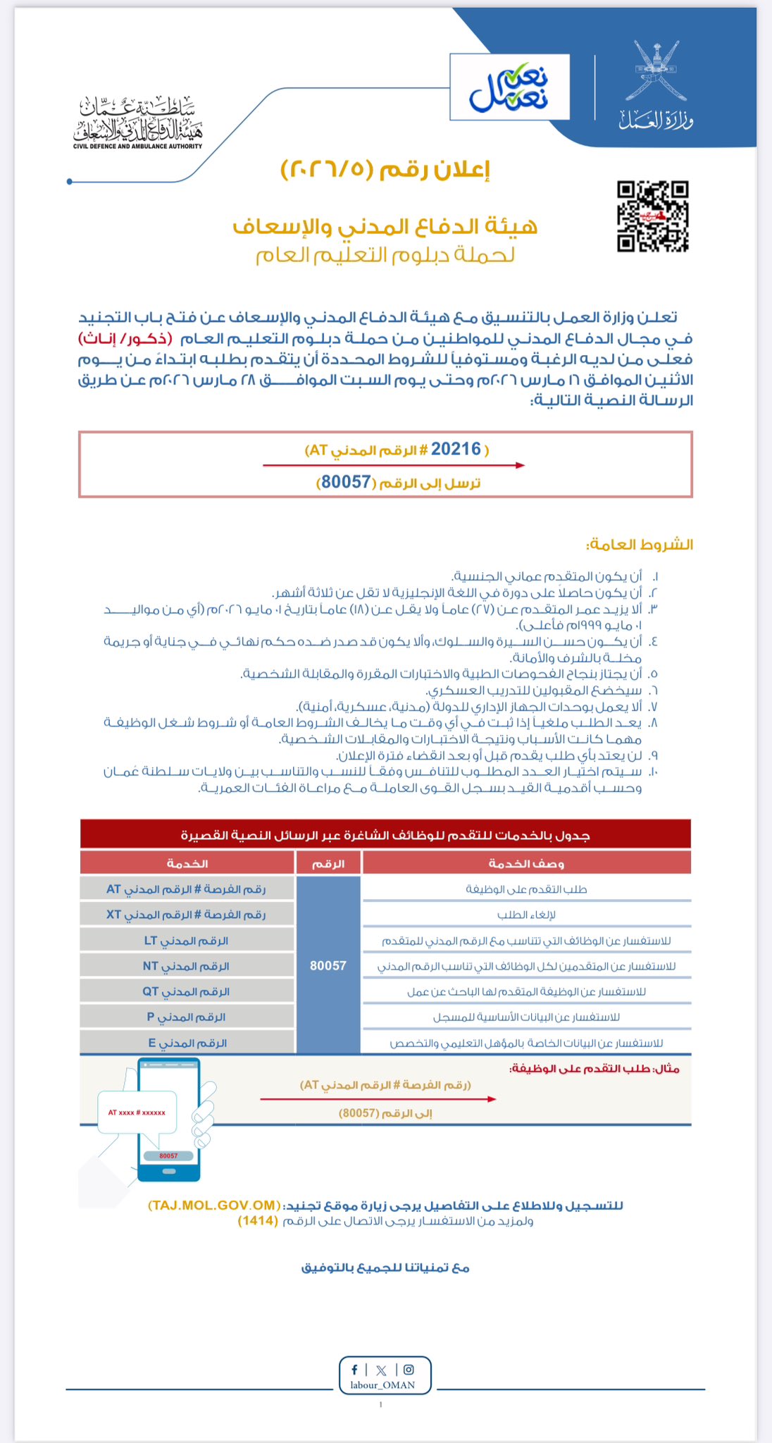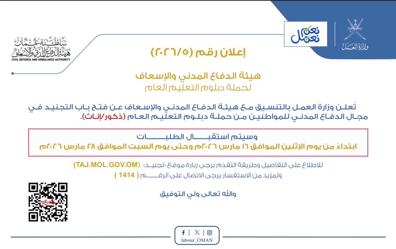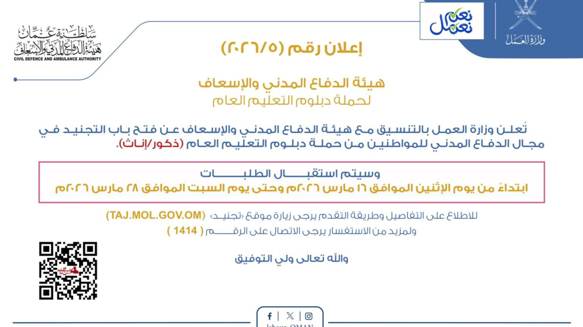أصدرت الوزارة الإعلان رقم (5 / 2026) الذي يفتح آفاقاً مهنية جديدة لحملة دبلوم التعليم العام (الثانوية العامة). الفرصة متاحة للجنسين (ذكور وإناث)، مما يعكس التزام الهيئة بتمكين الكوادر النسائية في مجالات الإنقاذ والإسعاف والدفاع المدني زثغجت بحسب ما تم تداوله على وسائل الإعلام .