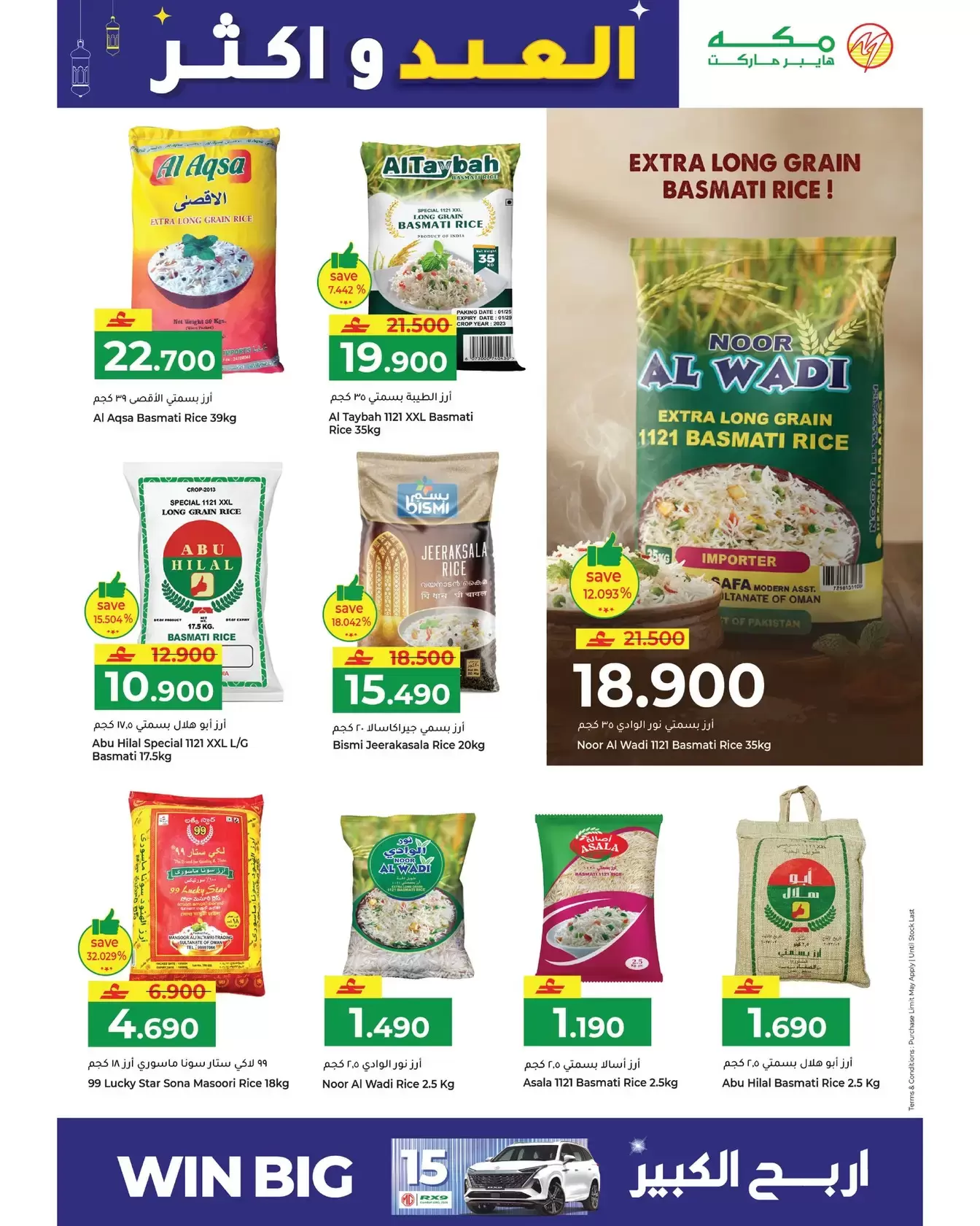 لا تخلو مائدة العيد في عمان من الأرز والزيت، وقد ركزت عروض مكة هايبر ماركت على توفير أجود الأنواع بخصومات حقيقية:
