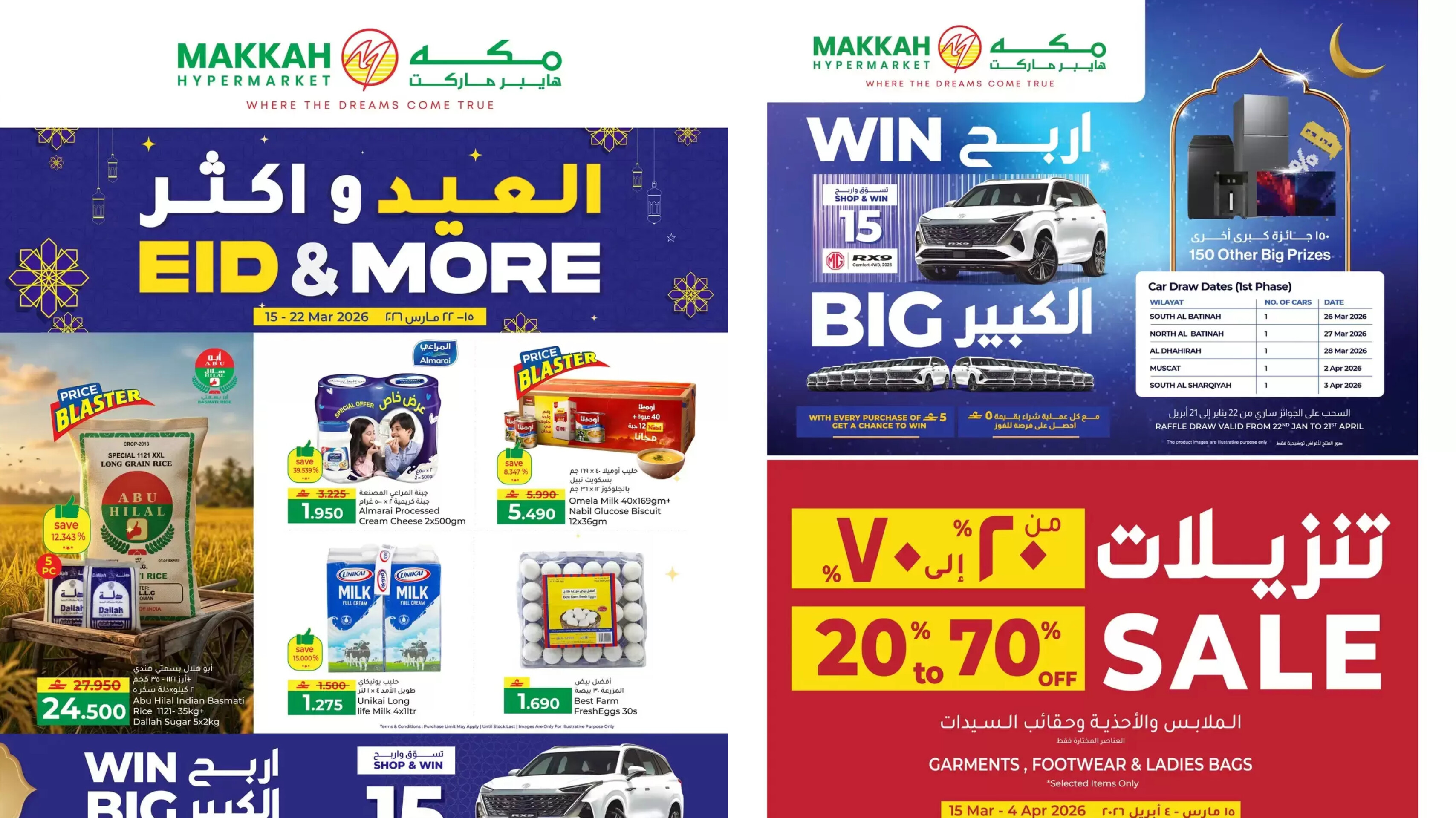 تعتبر عروض مكة هايبر ماركت في سلطنة عمان فرصة لا تفوت للتوفير قبل العيد. سواء كنت تبحث عن المقاضي الشهرية أو تريد تجربة حظك للفوز بسيارة الأحلام، فإن الوجهة الأنسب حالياً هي أقرب فرع لمكة هايبر ماركت إليك.