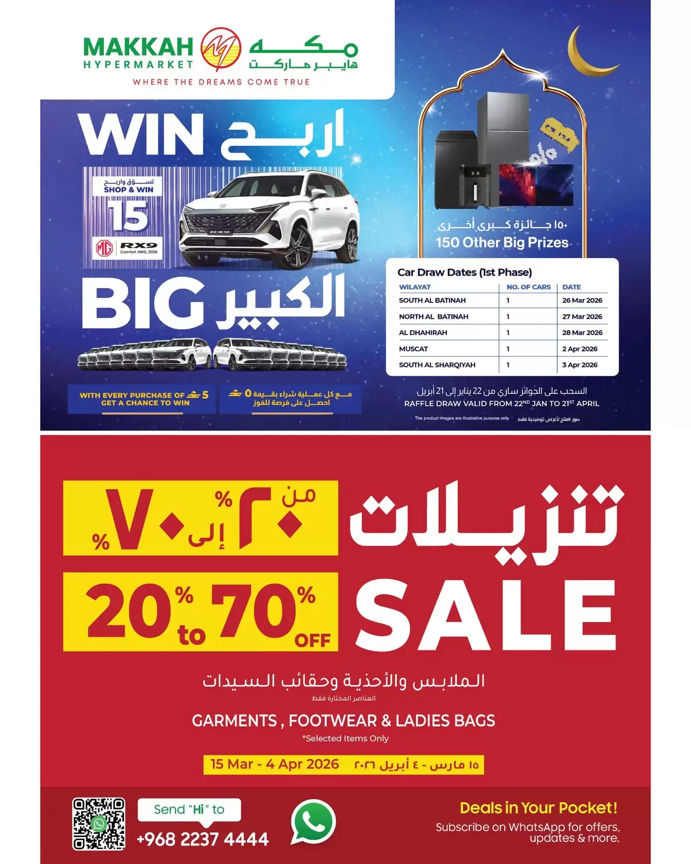أكثر ما يميز عروض مكة هايبر ماركت في عمان لهذا العام هو السحب الكبير. مقابل كل 5 ريالات عمانية تنفقها، تحصل على فرصة لدخول السحب على: