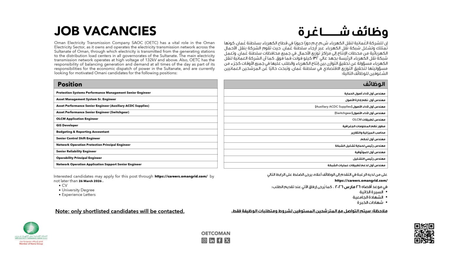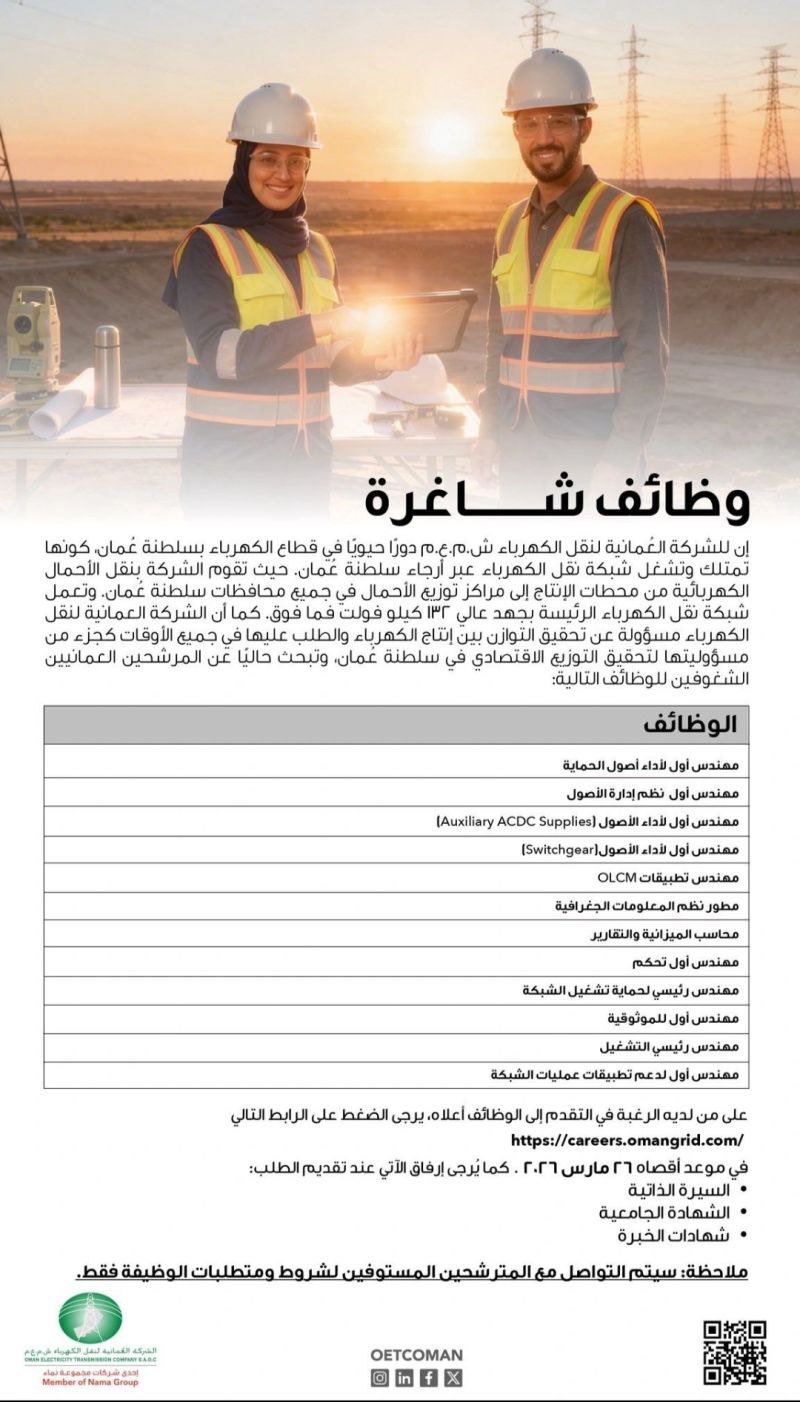 تفتح الشركة العمانية لنقل الكهرباء أبوابها للكفاءات الوطنية الراغبة في الانضمام إلى صرح رائد يشكل العمود الفقري لقطاع الطاقة في السلطنة . إذا كنت تبحث عن بيئة عمل احترافية تساهم في صياغة مستقبل الكهرباء، فإن هذه الفرصة هي طريقك الأمثل للنمو المهني.
