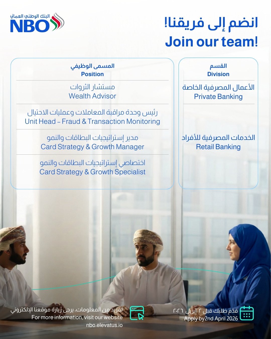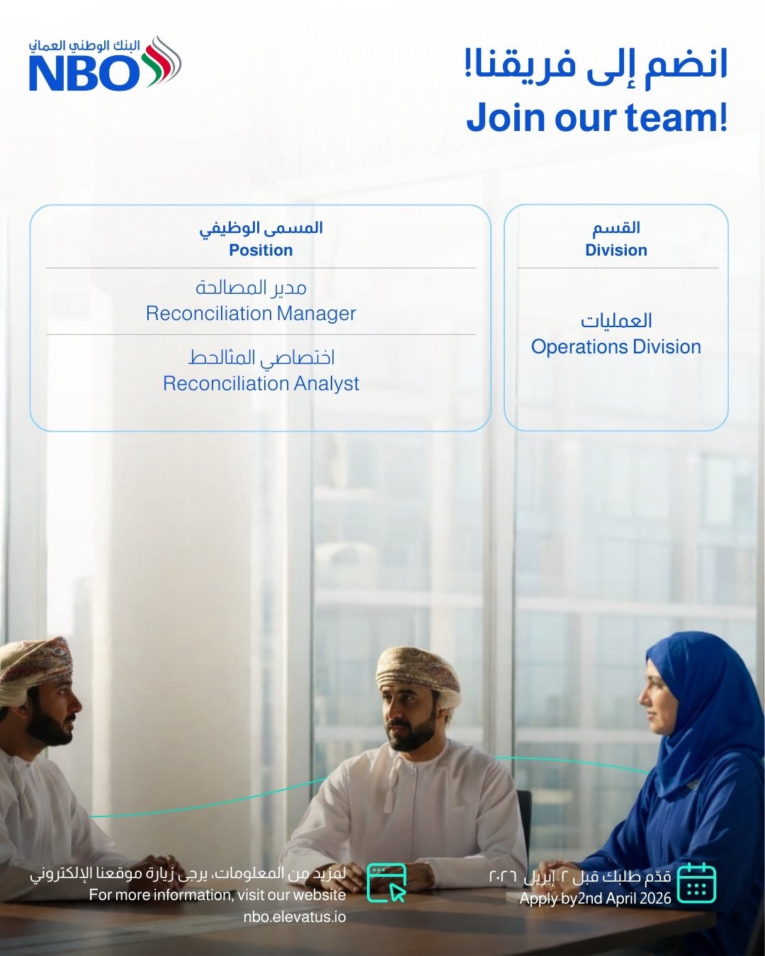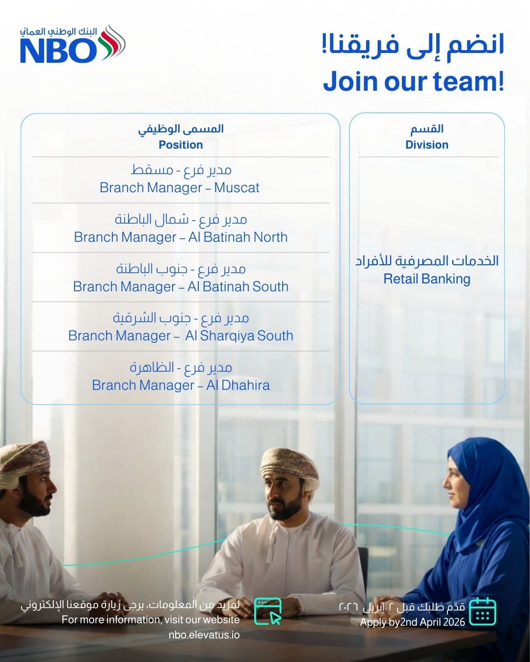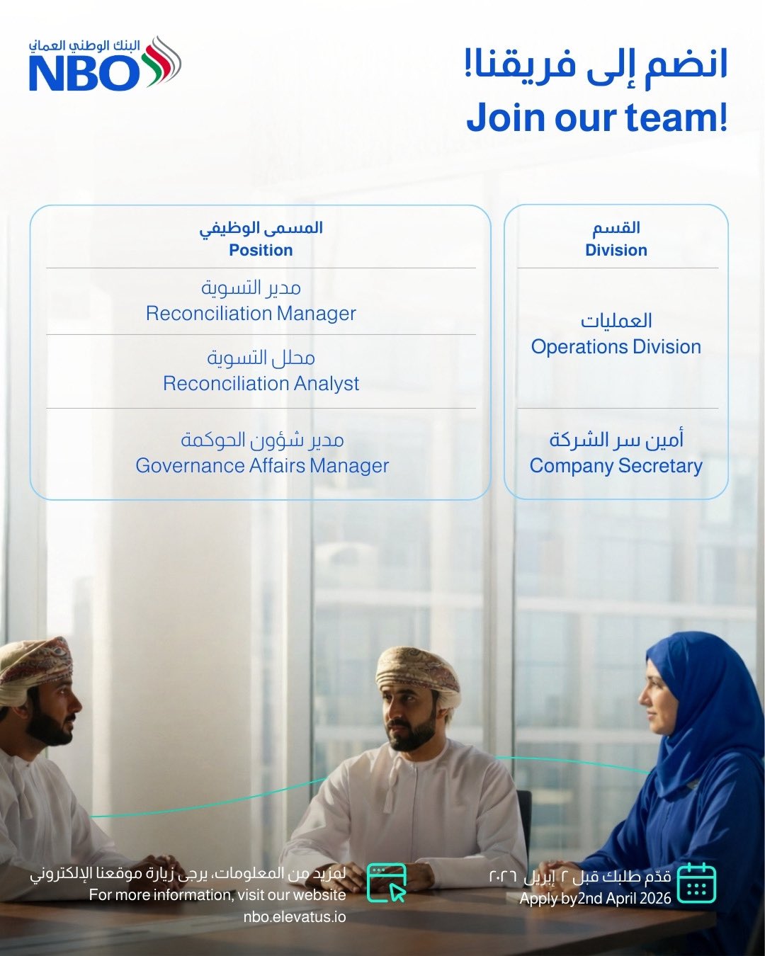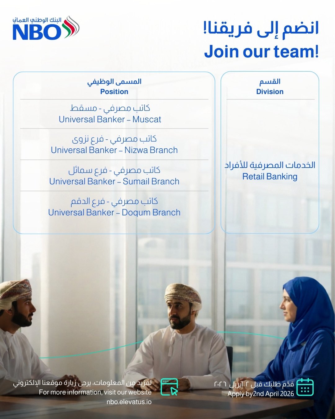 يجب على الراغبين في الانضمام لفريق عمل البنك الوطني العماني الإسراع في تقديم الطلبات، حيث أن آخر موعد هو: