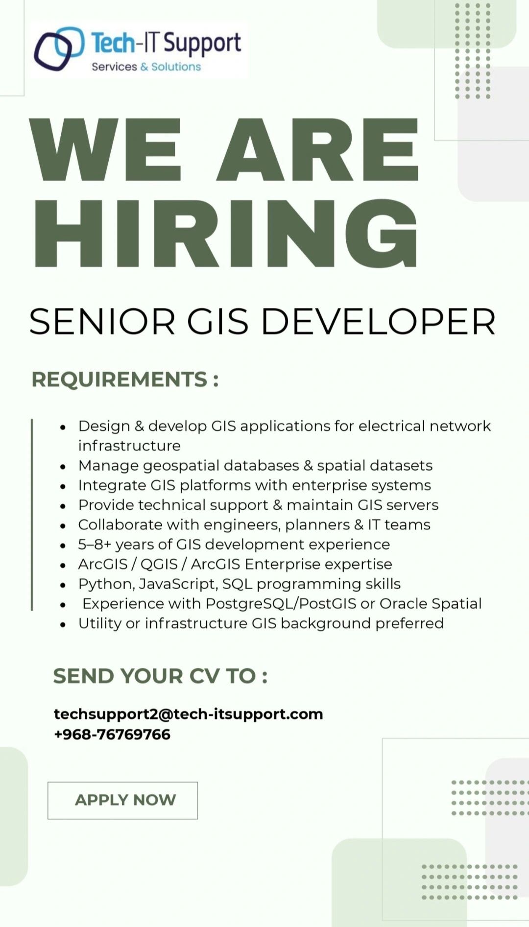 تفتح سلطنة عمان أبوابها مجدداً للمواهب التقنية الفذة، حيث أعلنت شركة دعم تكنولوجيا المعلومات (Tech IT Support) عن رغبتها في استقطاب كفاءات عالية لشغل وظيفة مطور نظم معلومات جغرافية أول (Senior GIS Developer) . تأتي هذه الخطوة لتعزيز فريق الابتكار بالشركة والمساهمة في تطوير حلول تقنية متقدمة تعتمد على البيانات المكانية.