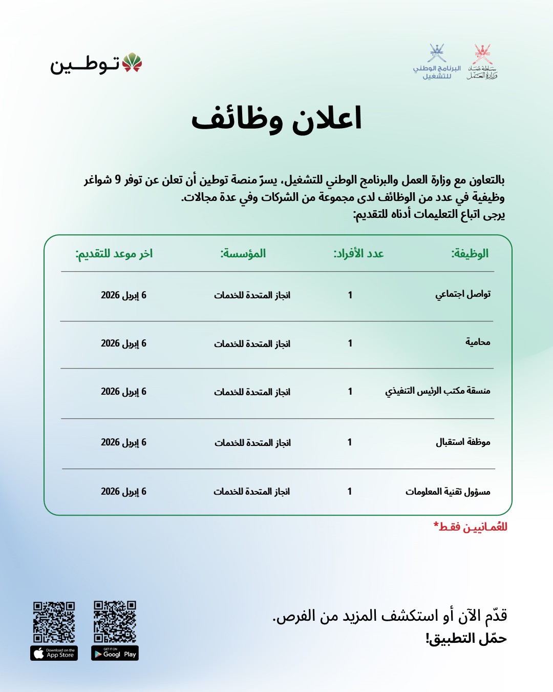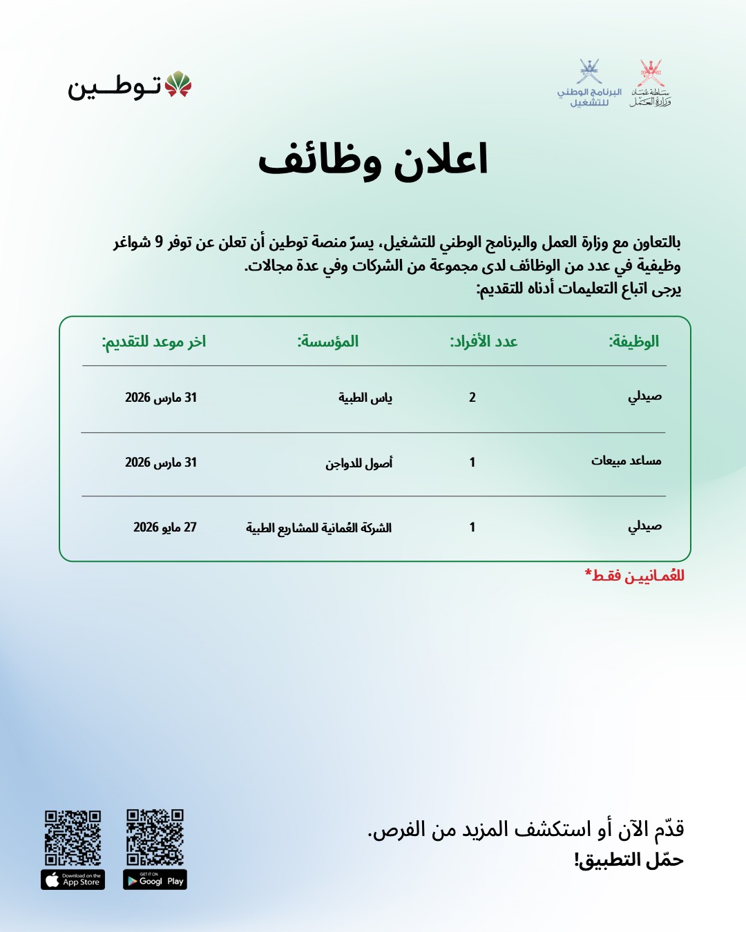 ملاحظة هامة: جميع هذه الوظائف مخصصة للعمانيين فقط، ويُنصح بالتقديم المبكر قبل اكتمال العدد المطلوب أو انتهاء التاريخ المحدد.