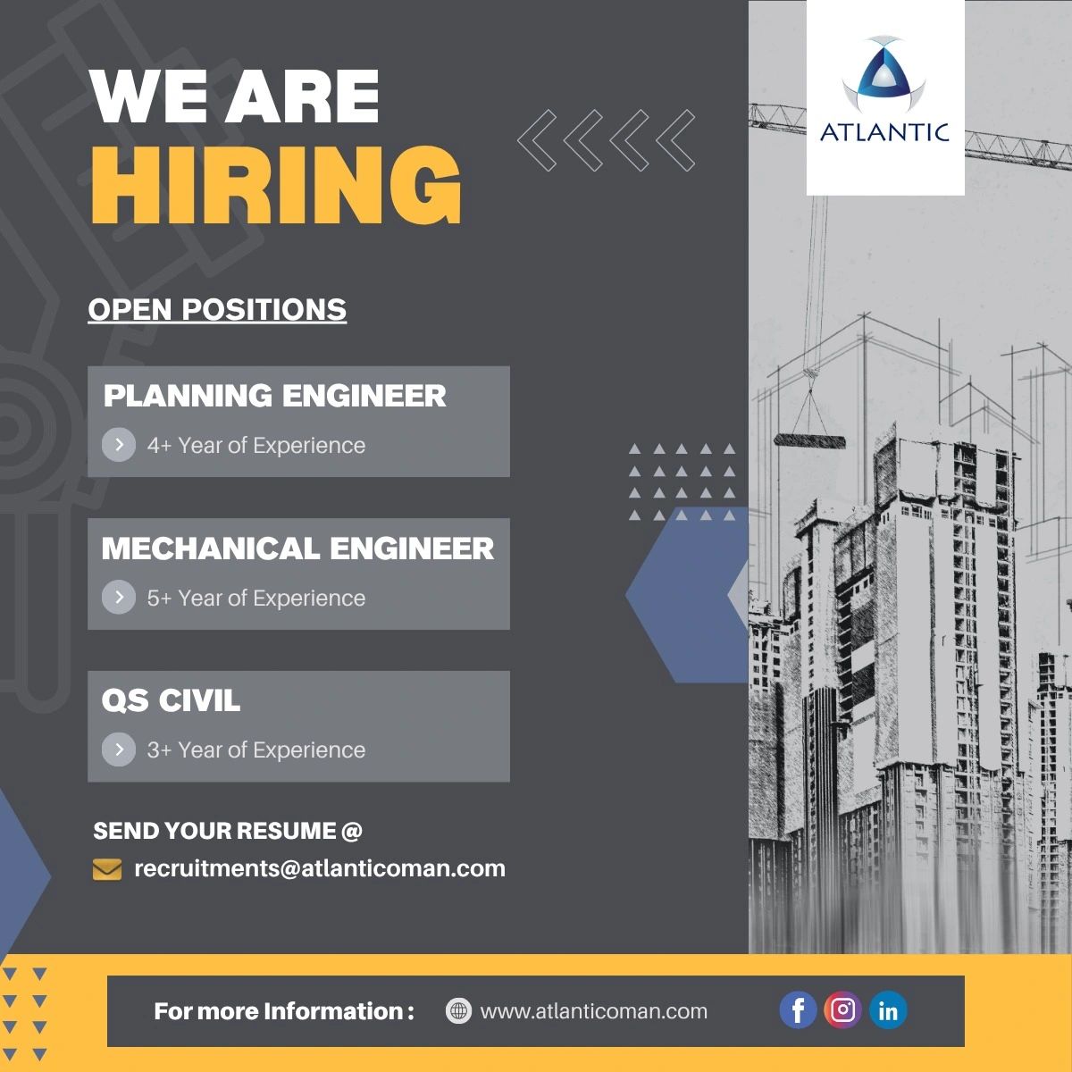 تؤكد شركة الأطلسي للإنشاءات على ضرورة تمتع المتقدمين بالمهارات التقنية اللازمة والقدرة على العمل ضمن بيئة عمل ديناميكية. ونظراً لحساسية الأدوار المطلوبة (خاصة في وظائف التخطيط والكميات)، فإن الأولوية ستكون لأصحاب السجلات المهنية المليئة بالإنجازات الملموسة.
