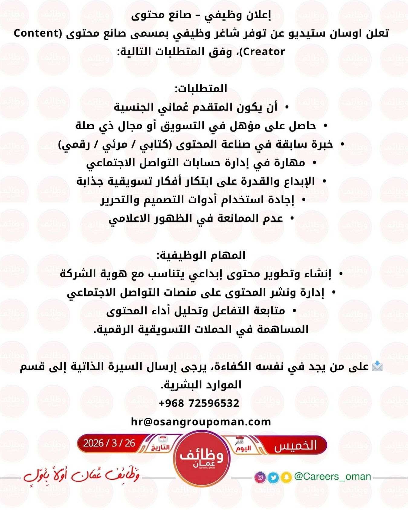 هل تمتلك الشغف لتحويل الأفكار إلى واقع مرئي ومكتوب؟ هل تبحث عن محطة انطلاق لمسيرتك المهنية في مجال الإعلام الرقمي؟ أعلنت شركة أوسان ستوديو (Osan Studio) في سلطنة عمان عن توفر شاغر وظيفي بمسمى صانع محتوى (Content Creator)، وهي فرصة مثالية للكوادر العمانية الشابة الطموحة .