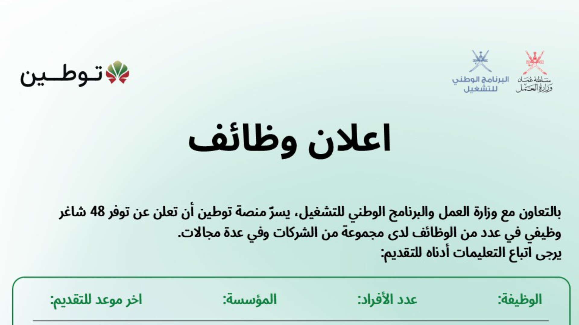 تستمر جهود التشغيل في سلطنة عمان في تسارع ملحوظ، حيث أعلنت منصة توطين، بالتعاون مع وزارة العمل و البرنامج الوطني للتشغيل، عن توفر 48 شاغراً وظيفياً جديداً في مجموعة متنوعة من التخصصات والقطاعات الحيوية . تأتي هذه المبادرة في إطار دعم الكوادر الوطنية العمانية وتوفير فرص عمل نوعية في كبرى الشركات والمؤسسات بالسلطنة.