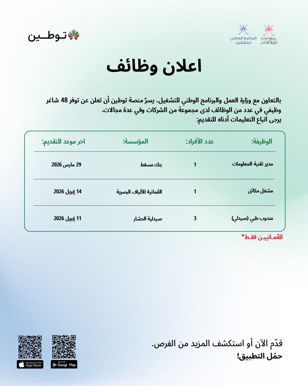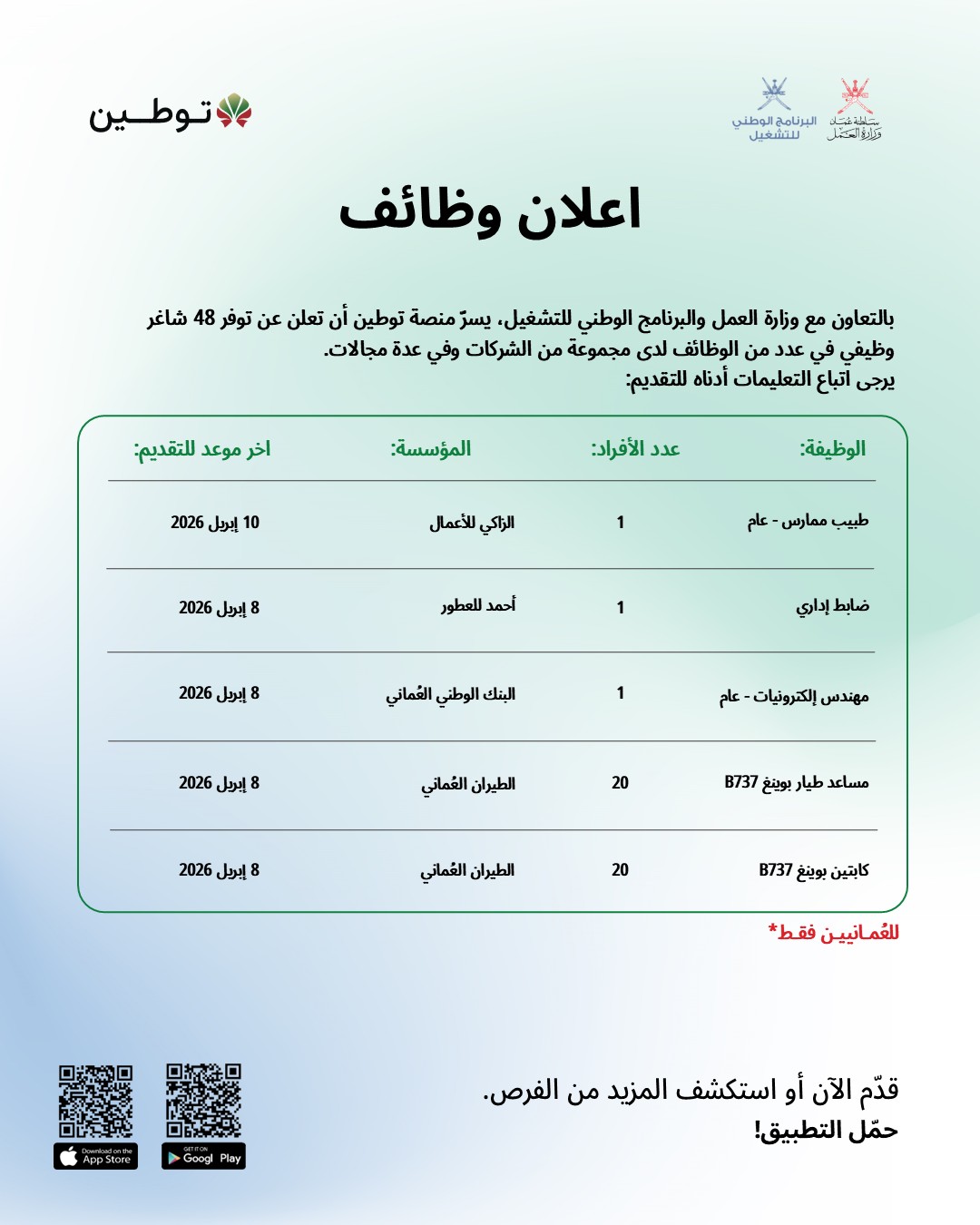 وفقاً لما ورد في الإعلان الرسمي، فإن هذه الفرص مخصصة للعمانيين فقط، وذلك تماشياً مع سياسة الإحلال وتوطين الوظائف في القطاع الخاص والشركات الحكومية المعمول بها في عام 2026.