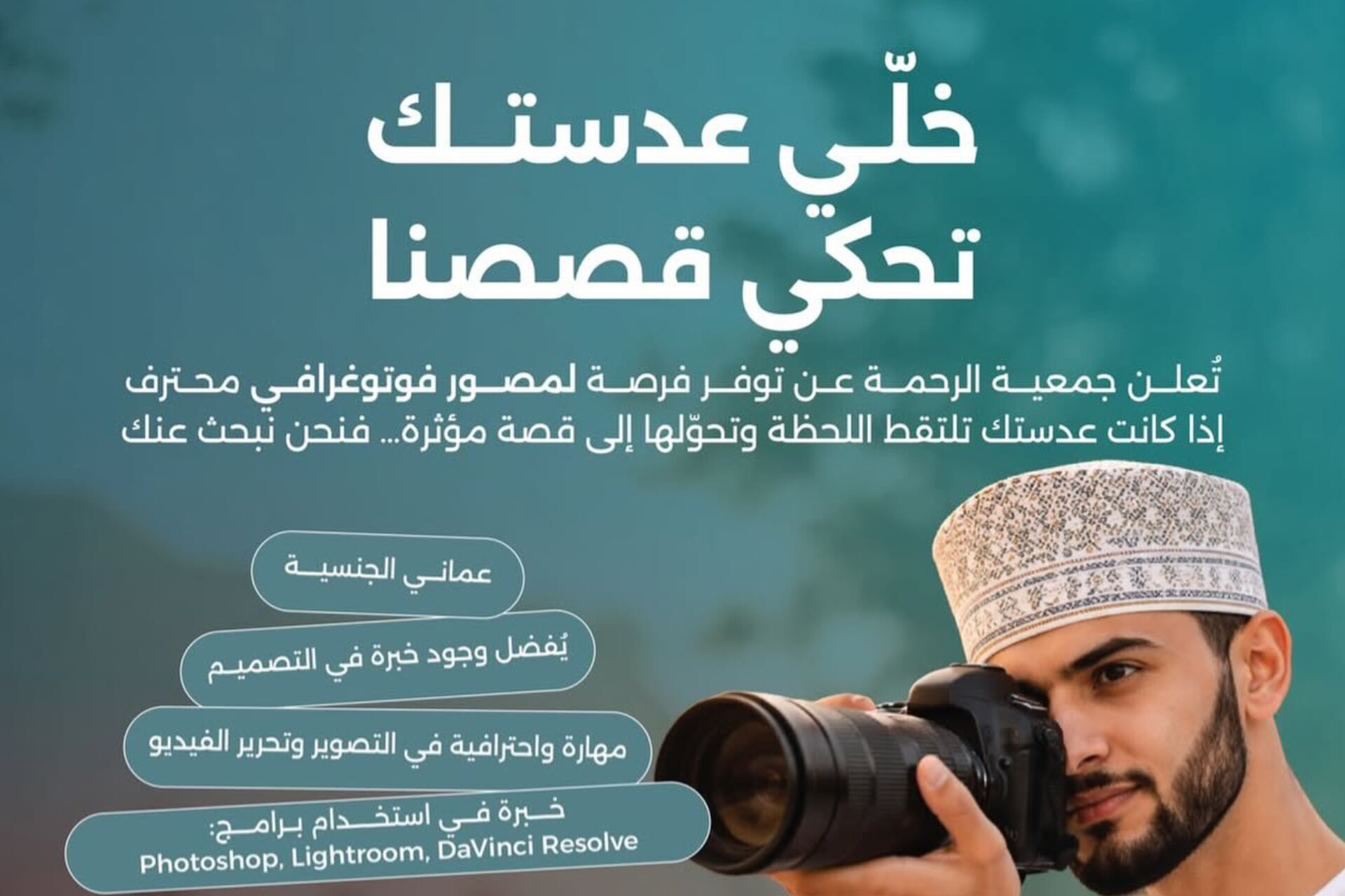 تعد سلطنة عمان بيئة خصبة للمبدعين والمصورين الذين يمتلكون "العين السحرية" القادرة على توثيق اللحظات وتحويلها إلى قصص إنسانية خالدة . وفي هذا السياق، أعلنت جمعية الرحمة عن توفر فرصة ذهبية للانضمام إلى فريقها كـ مصور فوتوغرافي محترف. إذا كانت عدستك تلتقط اللحظة وتحوّلها إلى قصة مؤثرة... فنحن نبحث عنك.