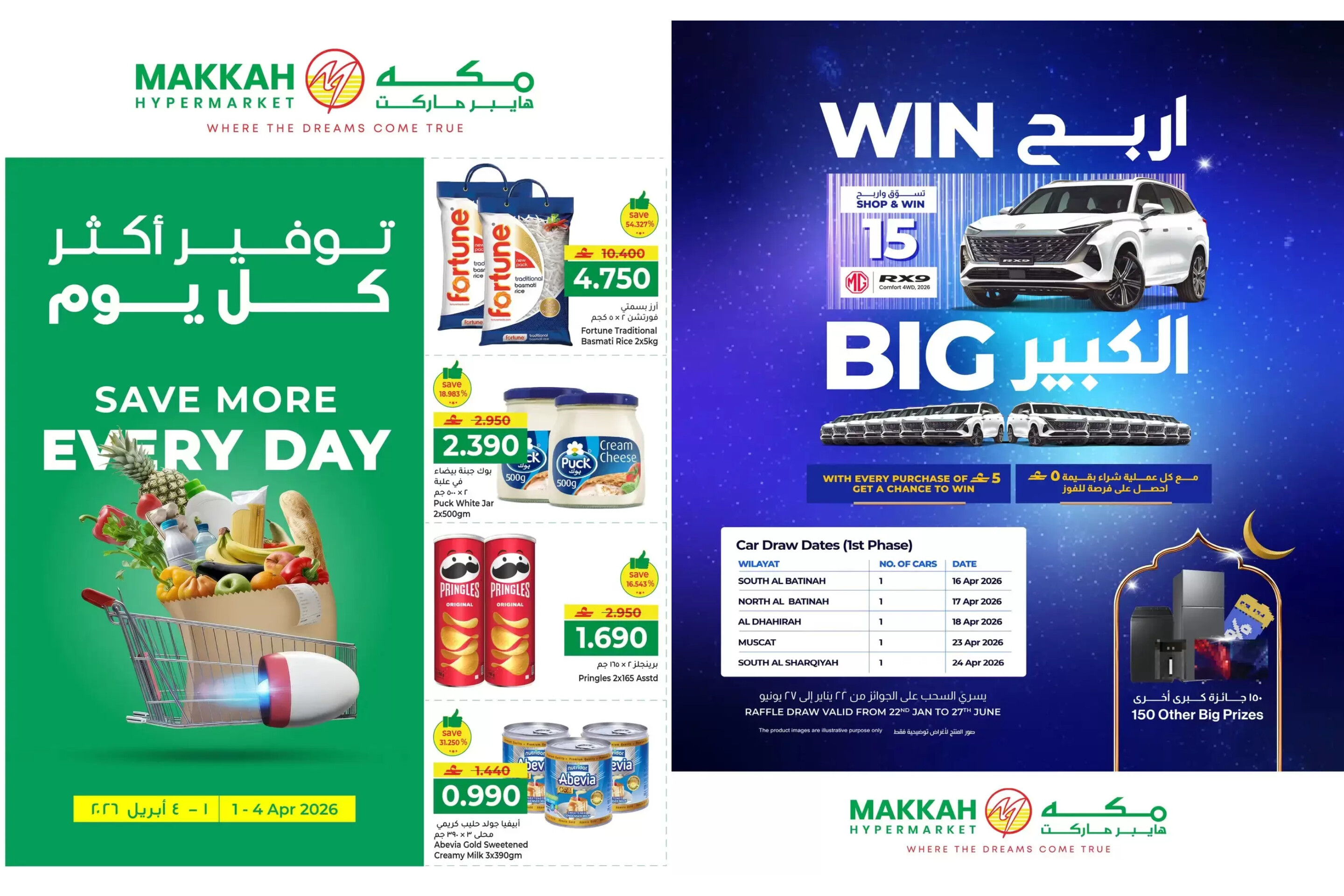 العروض سارية حتى نفاد الكمية في كافة فروع مكة هايبر ماركت بالسلطنة. سارع بزيارة أقرب فرع لك ولا تنسَ الاحتفاظ بفواتيرك لدخول السحب!