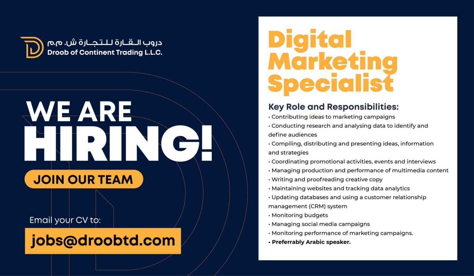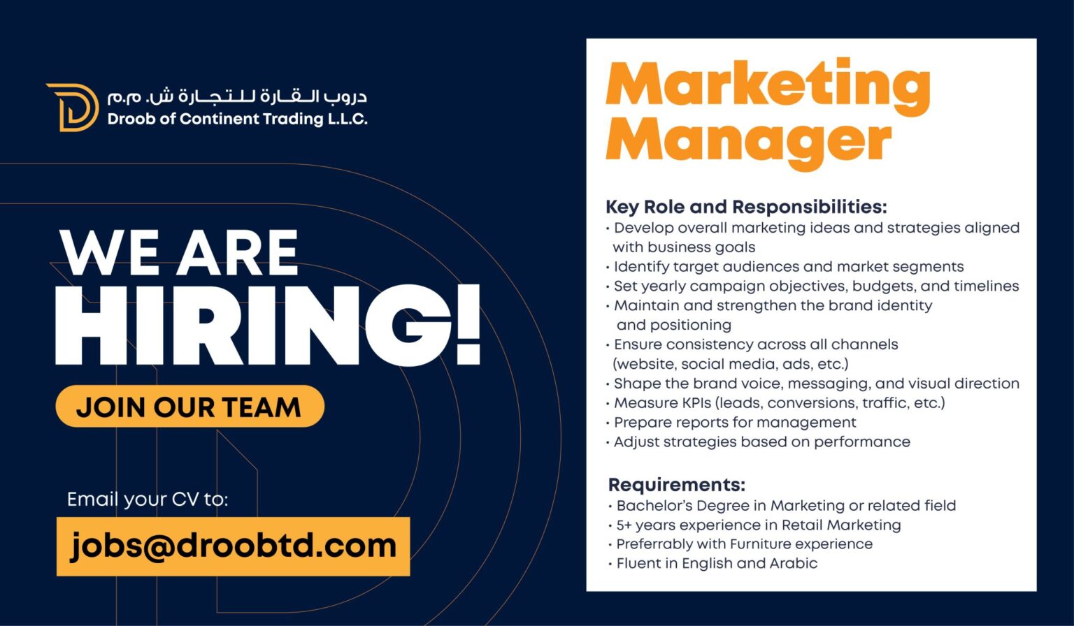 إذا كنت تجد في نفسك الكفاءة والشغف للانضمام إلى فريقنا، لا تتردد في التقديم الآن أو إرسال سيرتك الذاتية المحدثة، مع ذكر اسم الوظيفة في عنوان الرسالة، عبر البريد الإلكتروني التالي:
