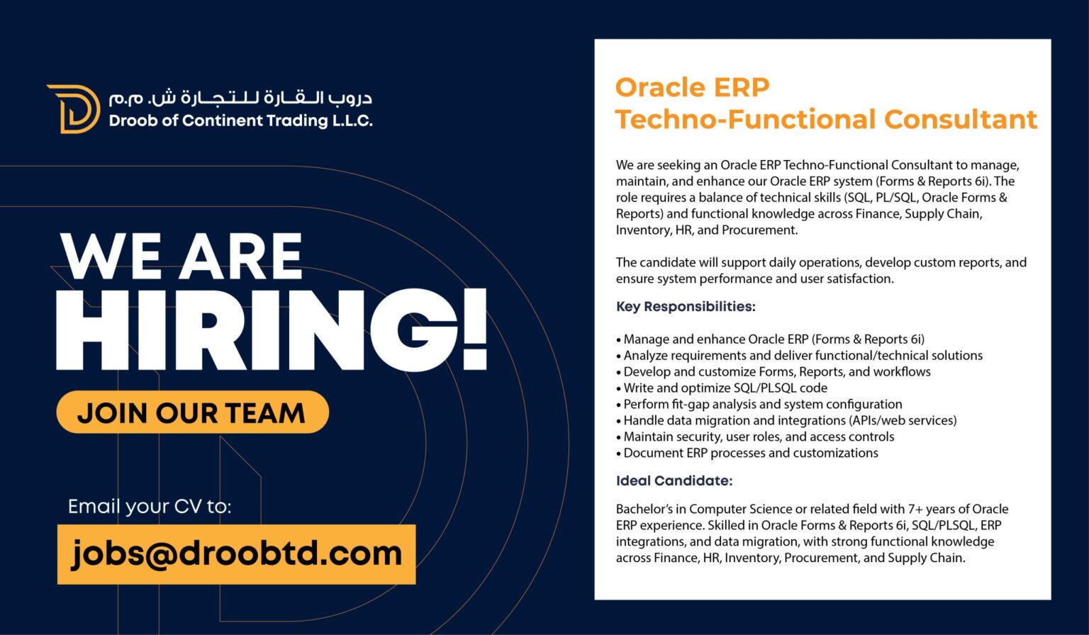 خبرة تخصصية لا تقل عن 7 سنوات في التعامل مع أنظمة أوراكل لتخطيط موارد المؤسسات (Oracle ERP).