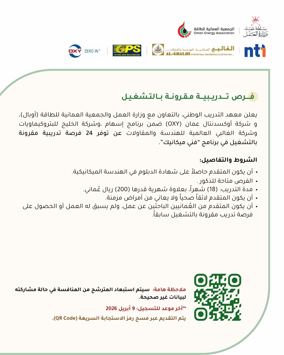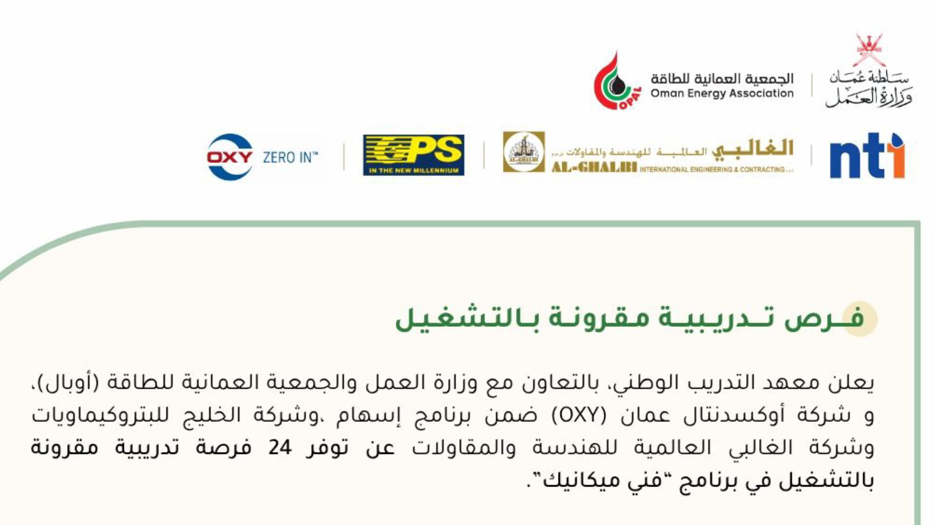 هل تبحث عن انطلاقة مهنية قوية في قطاع الطاقة؟ أعلن معهد التدريب الوطني بالتعاون مع وزارة العمل العمانية وجمعية أوبال، وبالشراكة مع كبرى شركات القطاع الخاص (أوكسدنتال عمان، الخليج للبتروكيماويات، والغالبي العالمية)، عن طرح مبادرة نوعية تهدف إلى تمكين الشباب العماني من خلال 24 فرصة تدريب مقرون بالتوظيف في تخصص "فني ميكانيك" .