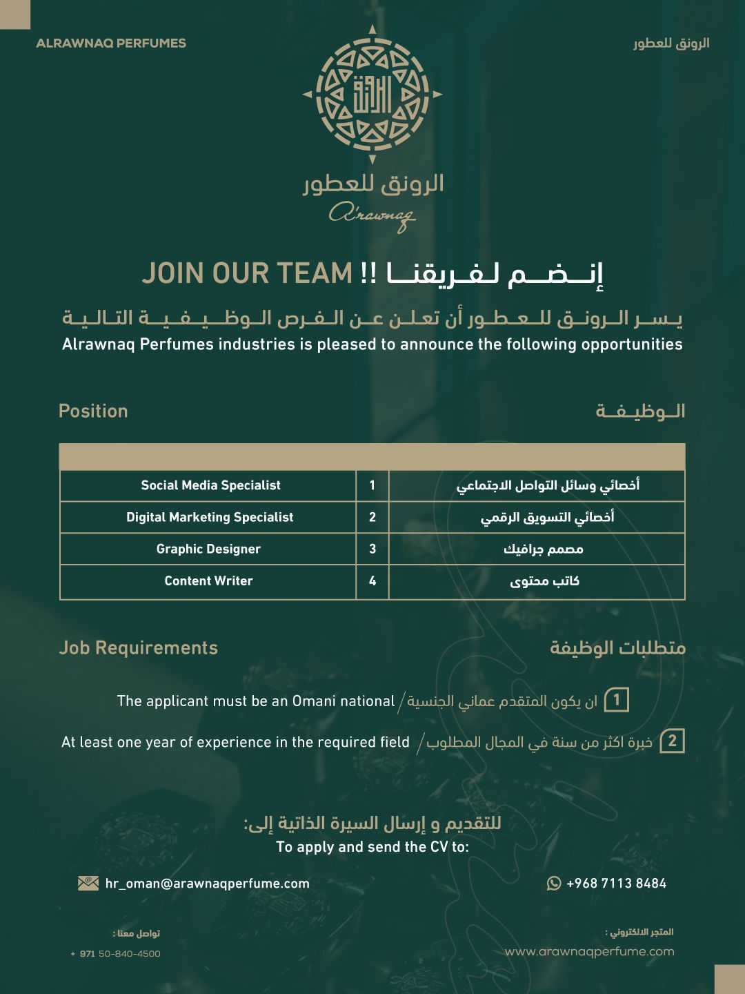 هل تبحث عن الانطلاقة الحقيقية لمسيرتك المهنية في عالم الإبداع والجمال؟ تُعلن شركة الرونق للعطور عن رغبتها في استقطاب كفاءات وطنية طموحة للانضمام إلى طاقمها المتميز داخل سلطنة عمان، موفرةً بيئة عمل ملهمة تُحفز على الابتكار والتطور المستمر .