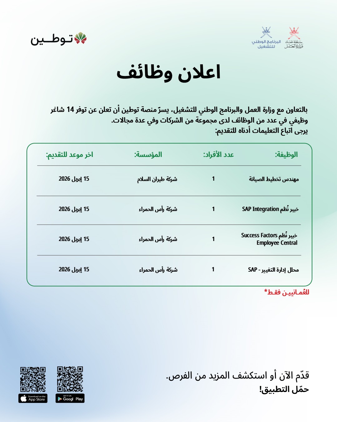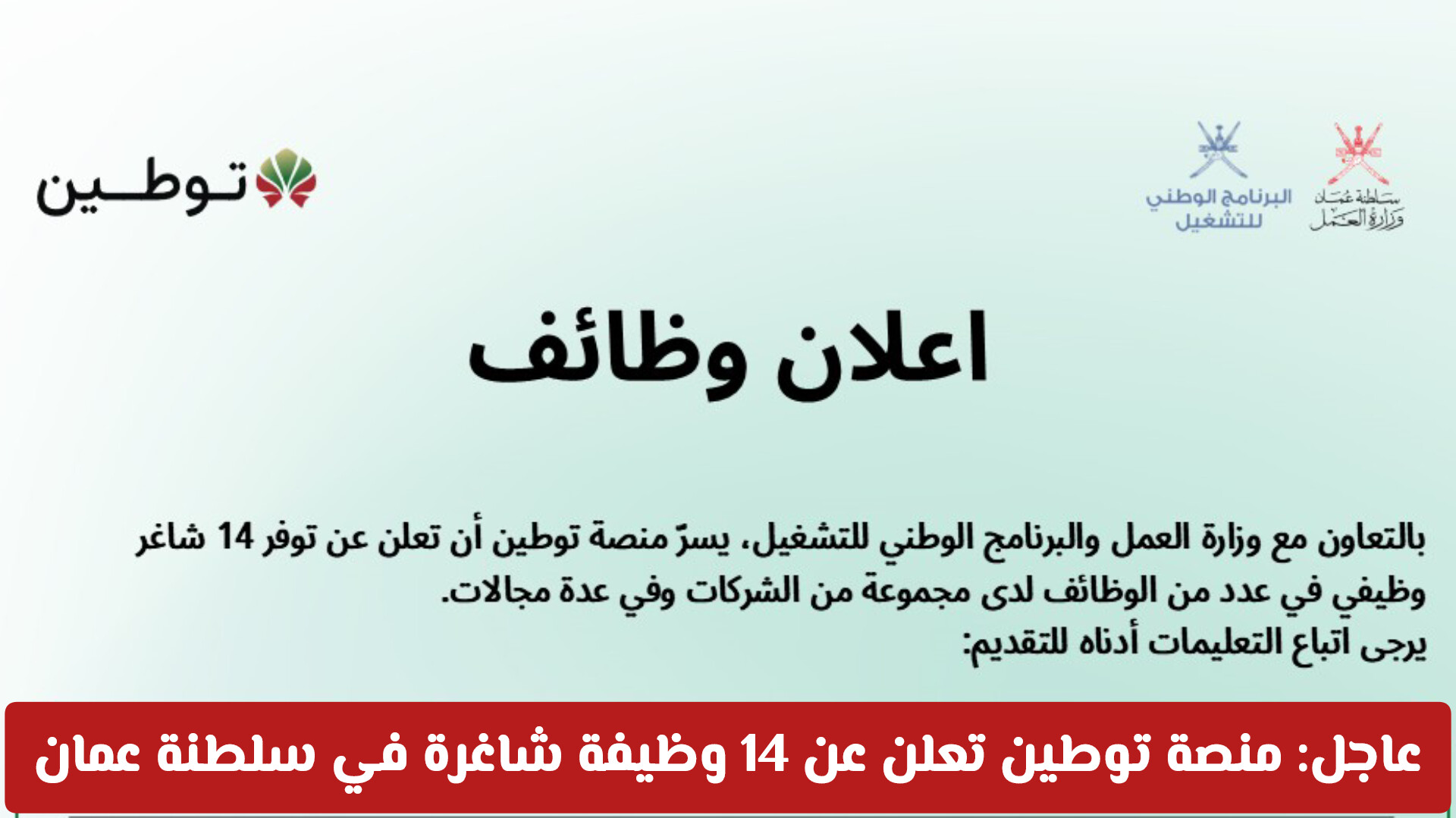 تستمر جهود سلطنة عمان في تعزيز سياسات الإحلال والتشغيل، وفي هذا الإطار أعلنت منصة "توطين"، بالتعاون مع وزارة العمل والبرنامج الوطني للتشغيل، عن طرح مجموعة جديدة من الفرص الوظيفية (14 شاغراً وظيفياً) في كبرى الشركات والمؤسسات بالسلطنة .