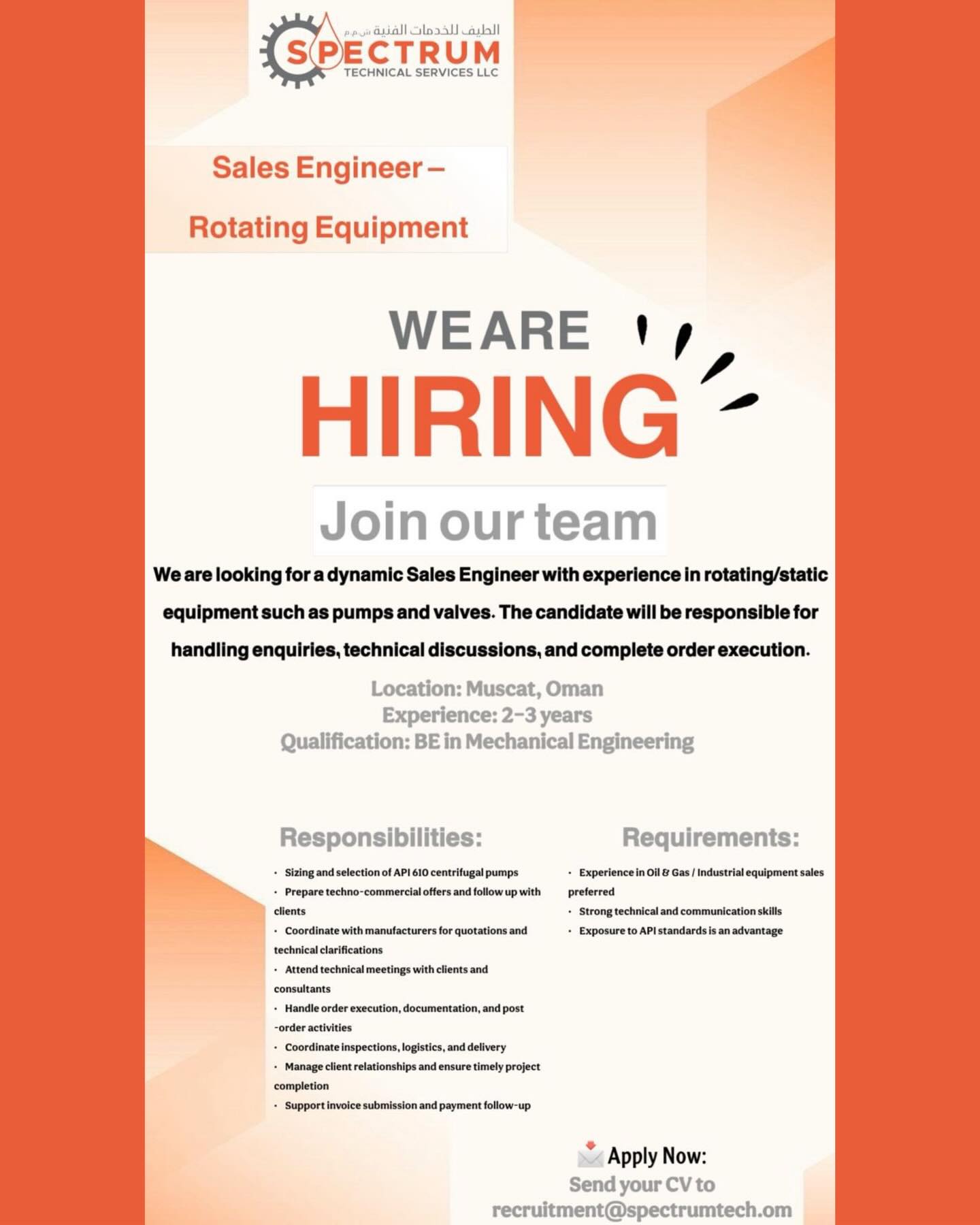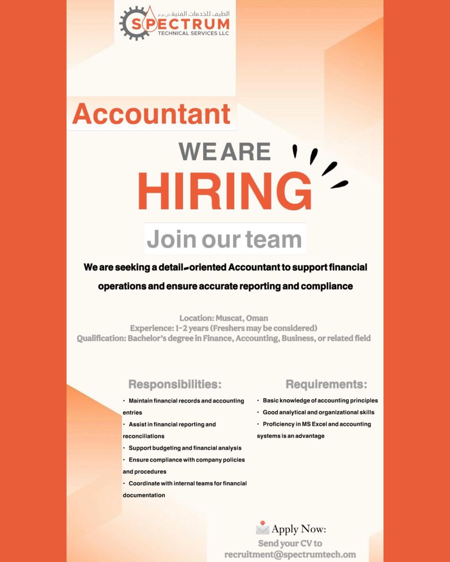 تعتبر سلطنة عمان بيئة خصبة للنمو المهني، وتوفر شركة Spectrum Technical Services منصة مثالية للمهندسين والمحاسبين للتفاعل مع مشاريع كبرى في قطاع الطاقة والخدمات الفنية، مما يعزز من مهاراتك العملية ويضعك على طريق النجاح المهني المستدام.