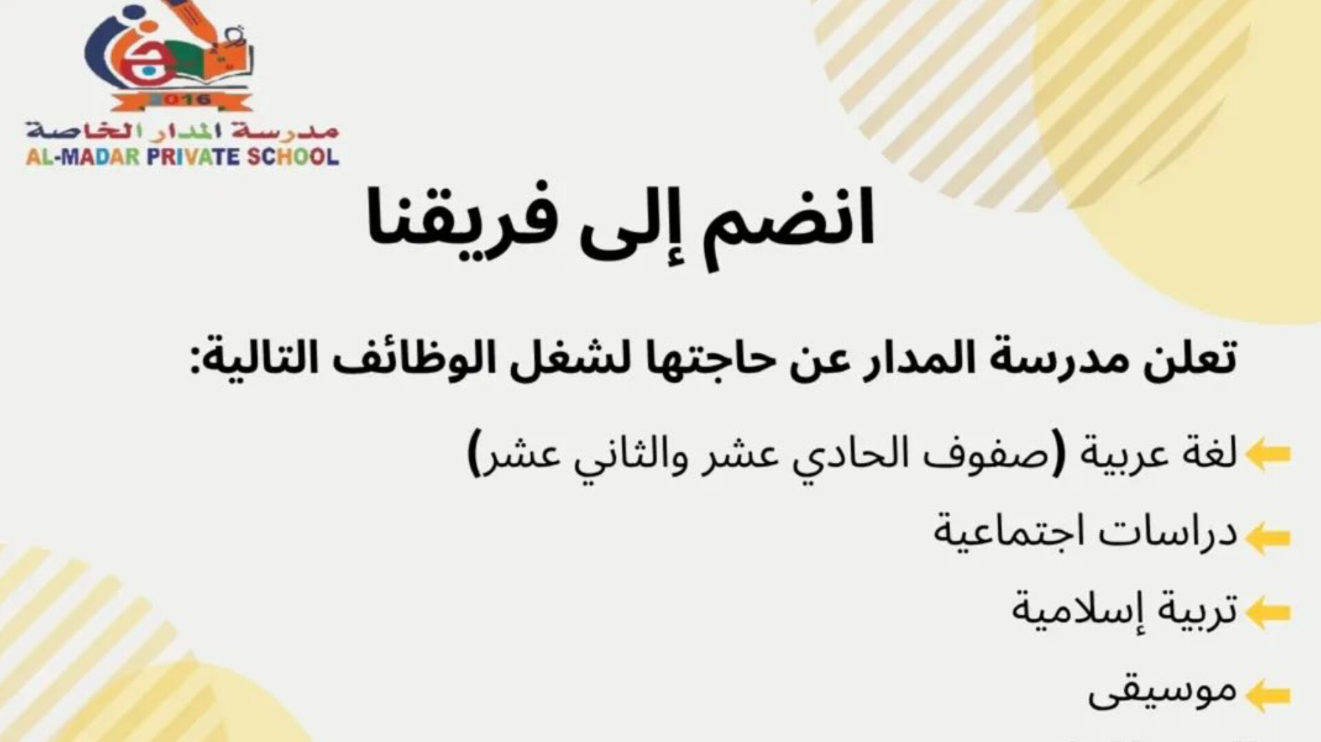 شمل إعلان مدرسة المدار قائمة متنوعة من الوظائف التعليمية لتغطية مختلف المراحل الدراسية، وهي كالتالي: