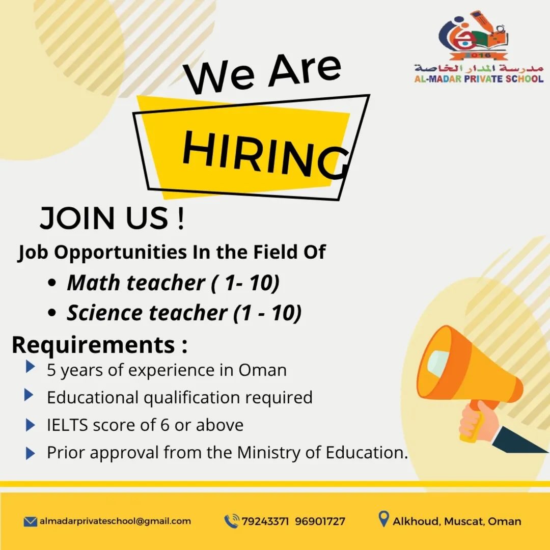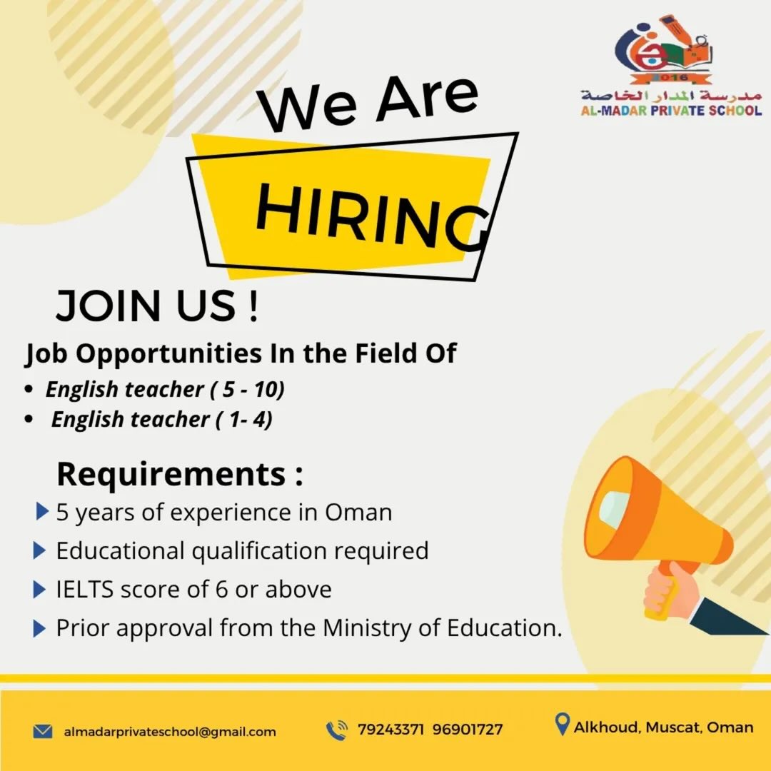 تعتبر هذه الفرص مثالية للمعلمين والمعلمات المقيمين داخل السلطنة والذين يمتلكون الخبرة والكفاءة للانضمام إلى بيئة تعليمية محفزة بمدينة الخوض طثحجظ بحسب ما تم تداوله على وسائل الإعلام .