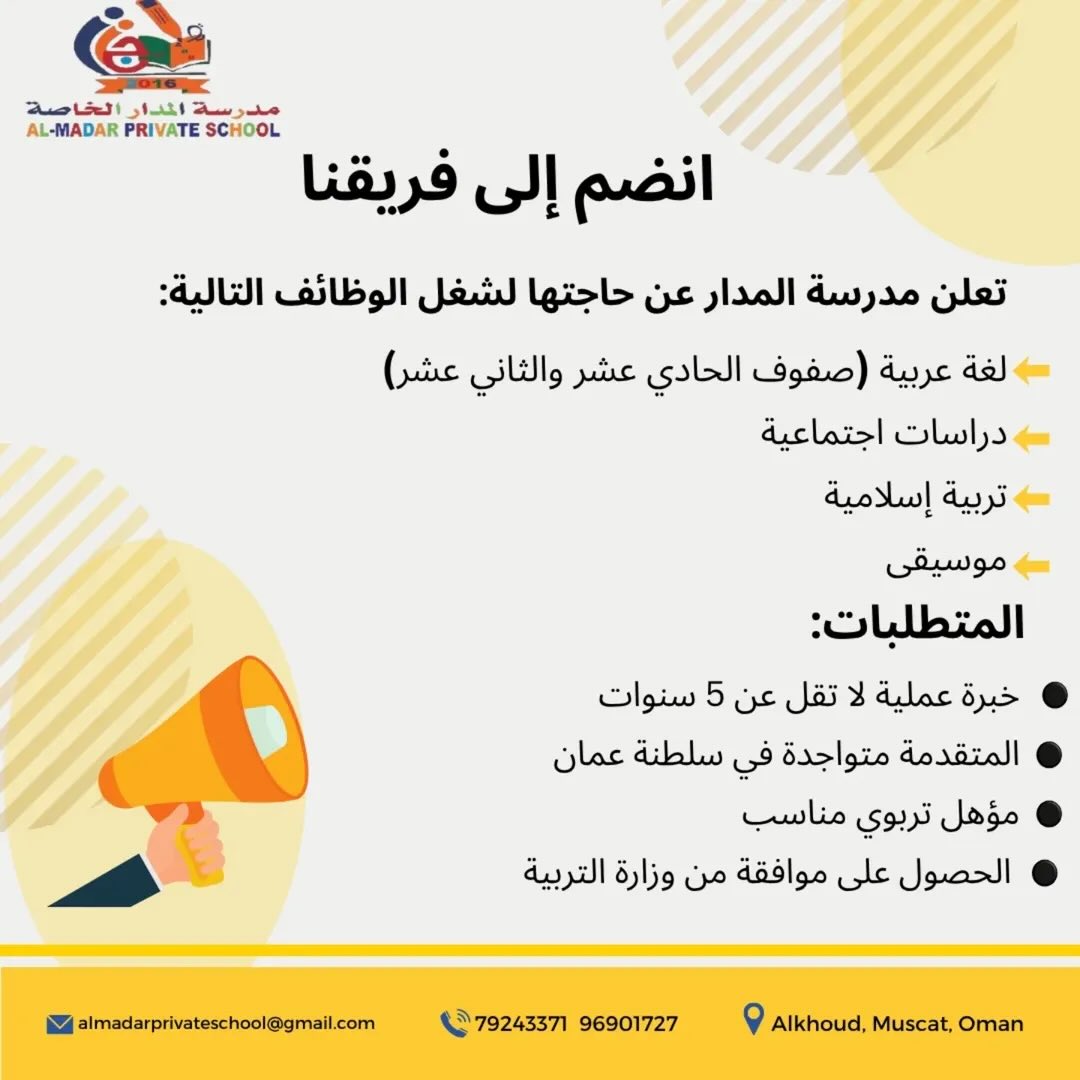 هل تبحث عن فرصة لتطوير مسيرتك المهنية في قطاع التعليم داخل سلطنة عمان؟ أعلنت مدرسة المدار الخاصة (Al-Madar Private School)، الصرح التعليمي الرائد في محافظة مسقط، عن فتح باب التوظيف لمجموعة من التخصصات الأكاديمية للعام الدراسي الحالي .