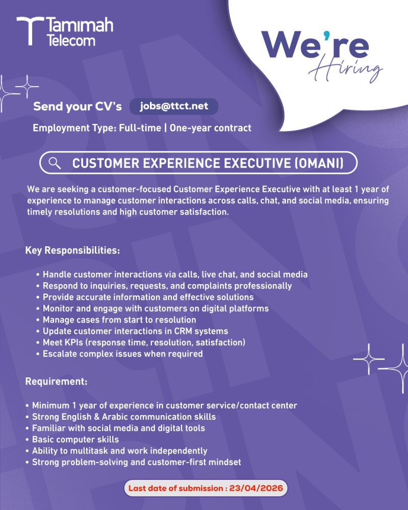 تستمر سلطنة عمان في تعزيز سوق العمل بالكفاءات الوطنية، وفي هذا السياق، أعلنت شركة تميمة للاتصالات (Tamimah Telecom) عن فتح باب التوظيف للعمانيين الطموحين للانضمام إلى فريقها المتميز في وظيفة مسؤول تنفيذي تجربة العملاء (Customer Experience Executive) .