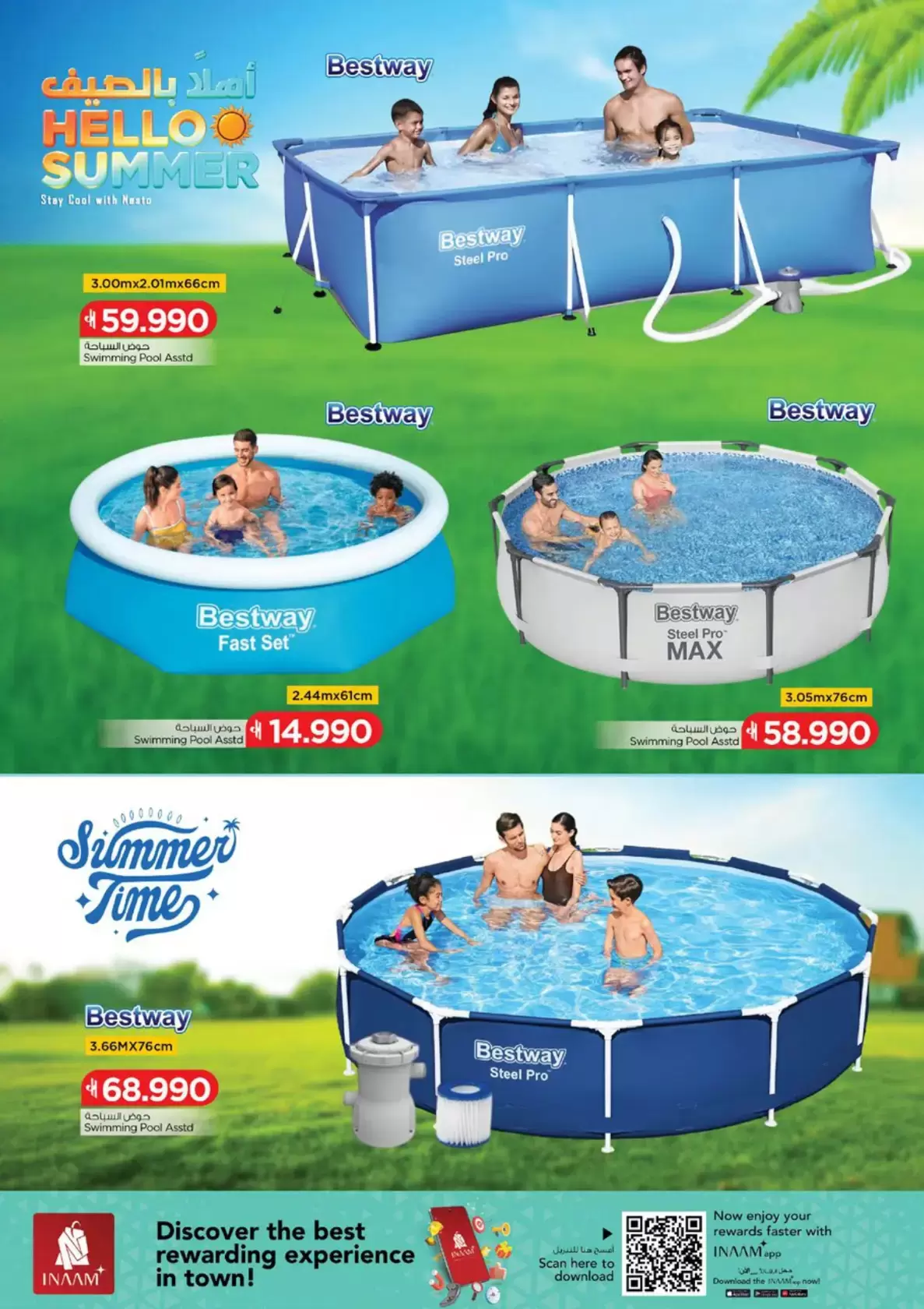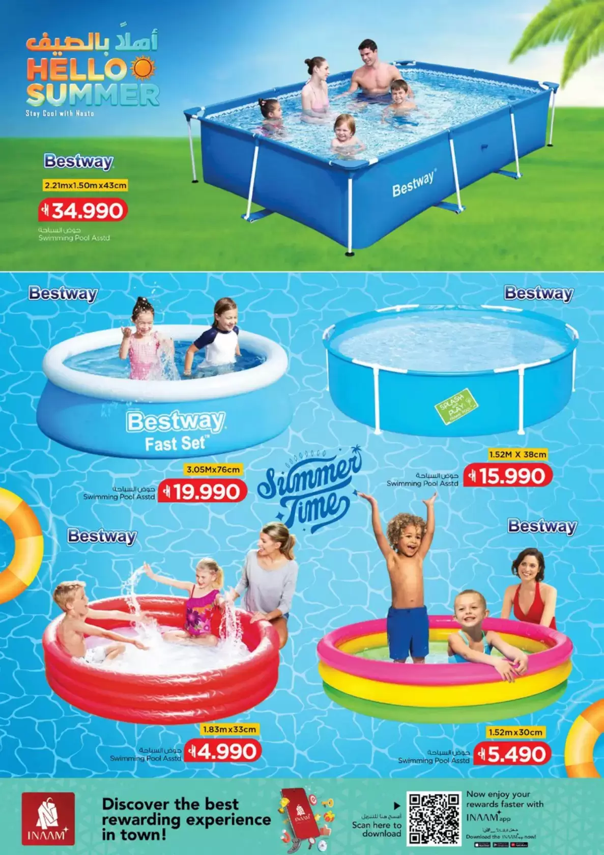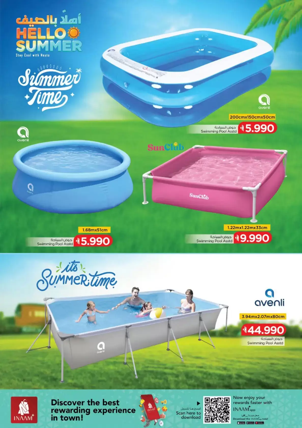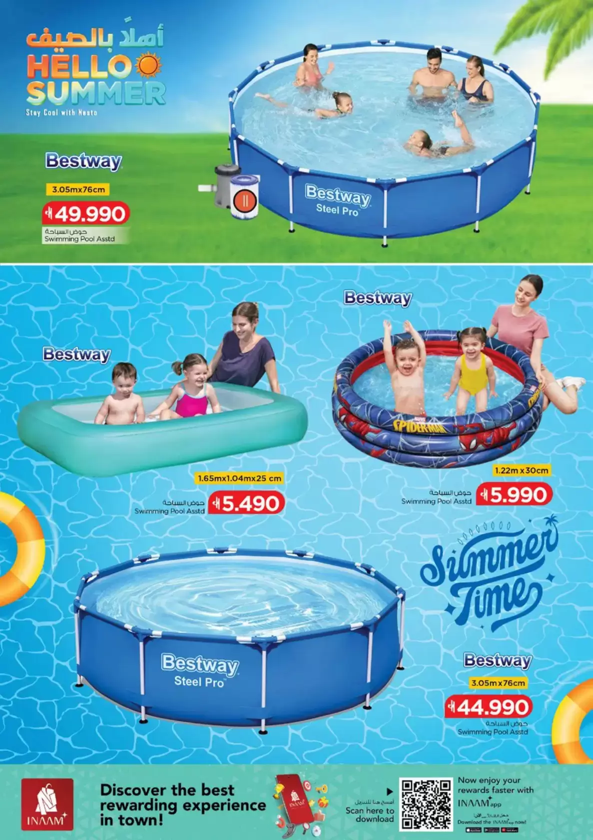 مع ارتفاع درجات الحرارة في سلطنة عمان، يبحث الجميع عن الطريقة المثلى لتبريد الأجواء والاستمتاع بالوقت مع العائلة . أطلقت نستو هايبر ماركت (Nesto Oman) حملتها المنتظرة "أهلاً بالصيف" (Hello Summer)، والتي تتضمن تخفيضات هائلة على المسابح المنزلية ومستلزمات السباحة.