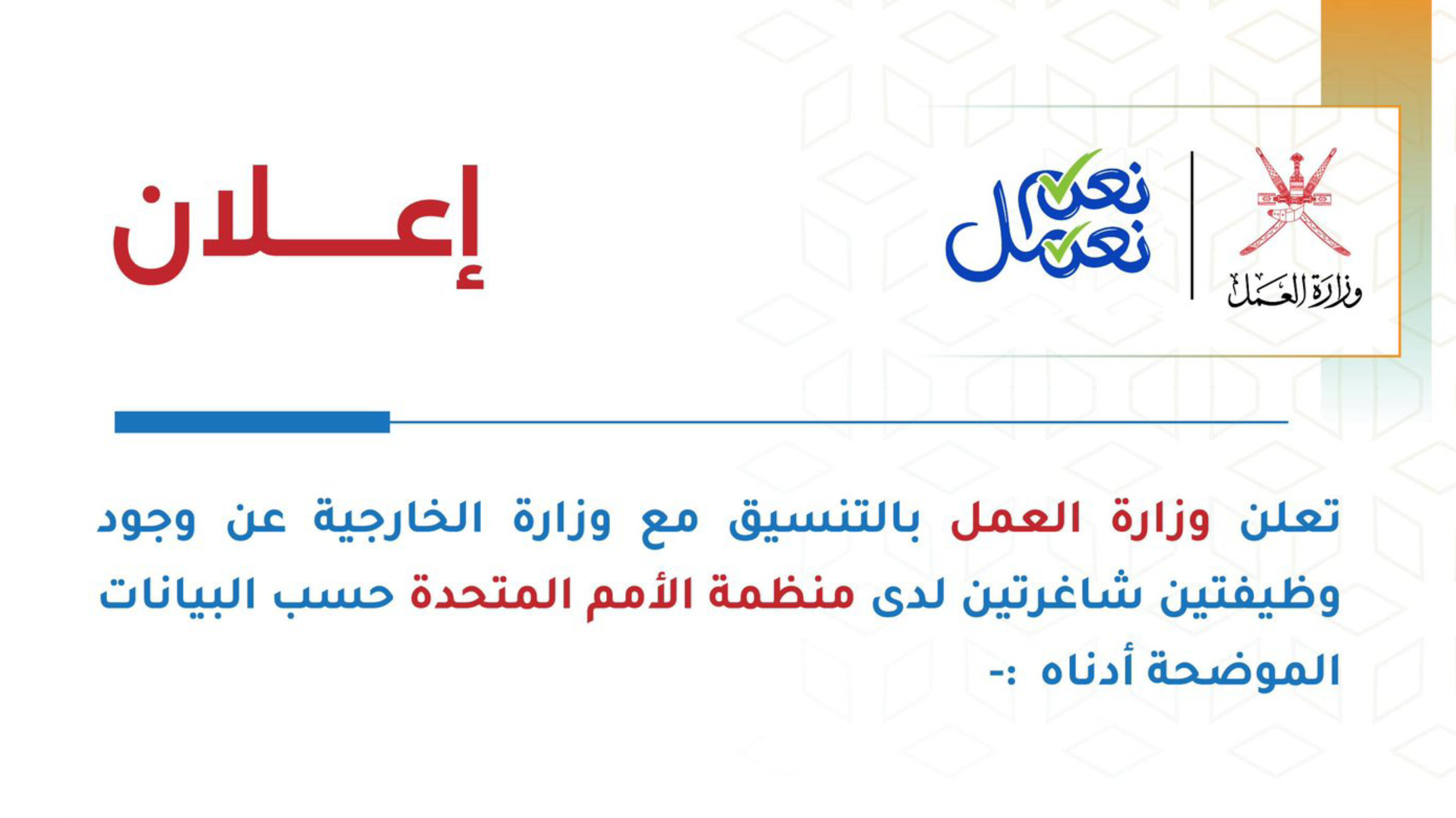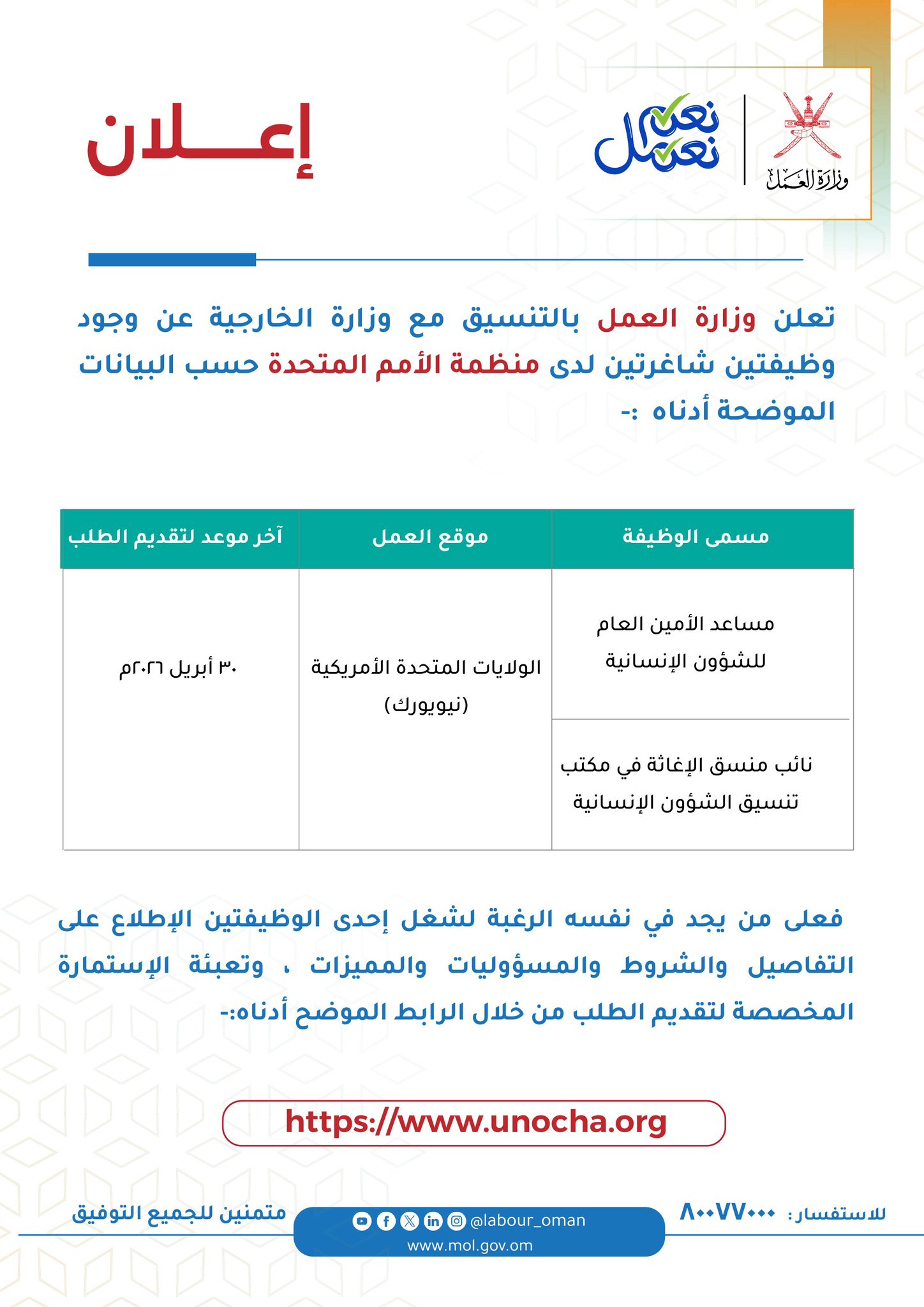 في خطوة تعزز من حضور الكفاءات العمانية في المحافل الدولية، أعلنت وزارة العمل بالتنسيق مع وزارة الخارجية في سلطنة عمان عن توفر فرص وظيفية مرموقة لدى منظمة الأمم المتحدة . تأتي هذه المبادرة لفتح آفاق عالمية للكوادر الوطنية الطموحة للمشاركة في صنع القرار الإنساني الدولي.