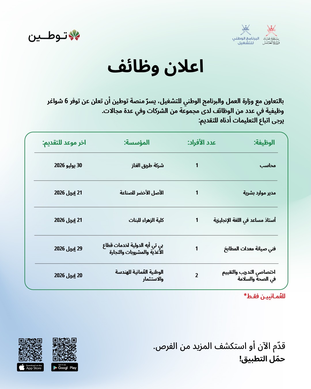 ندعو جميع الكوادر الوطنية المؤهلة للمسارعة في تحديث بياناتهم والتقدم للوظائف التي تتناسب مع خبراتهم ومؤهلاتهم قبل انتهاء المواعيد المحددة لكل شاغر.