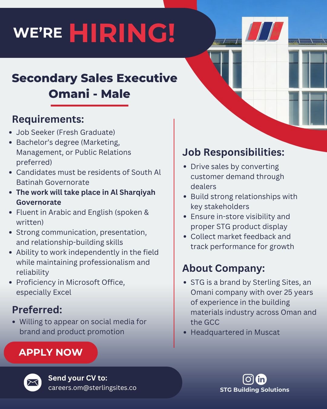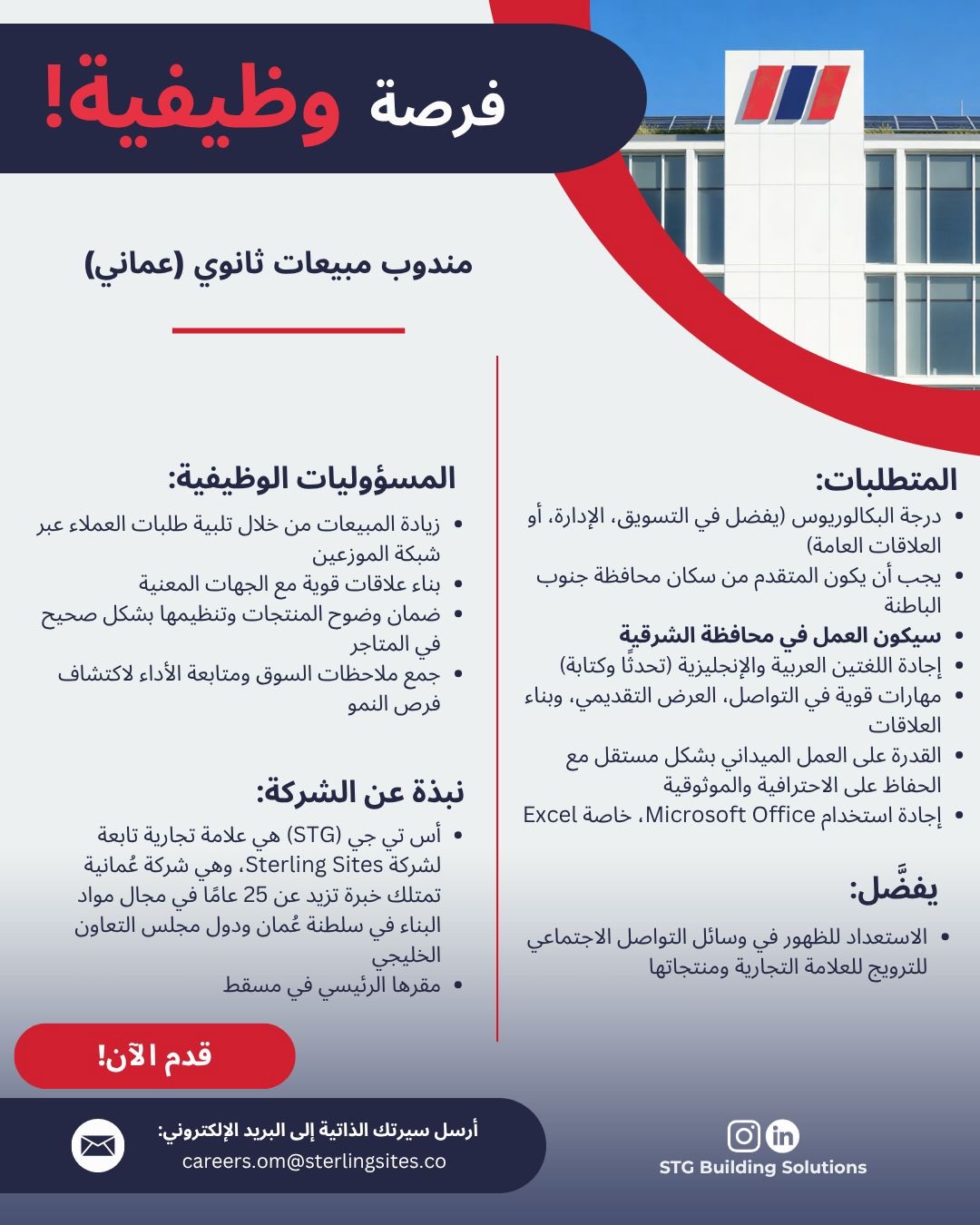 تبحث عن انطلاقة حقيقية لمسيرتك المهنية في واحدة من كبرى الشركات العمانية؟ أعلنت شركة Sterling Sites، الرائدة في قطاع مواد البناء بسلطنة عمان، عن فتح باب التوظيف للعمانيين الطموحين للانضمام إلى فريقها تحت العلامة التجارية الشهيرة STG . إذا كنت من حديثي التخرج وتملك الشغف بمجال المبيعات والتسويق، فهذه الفرصة مصممة لك.