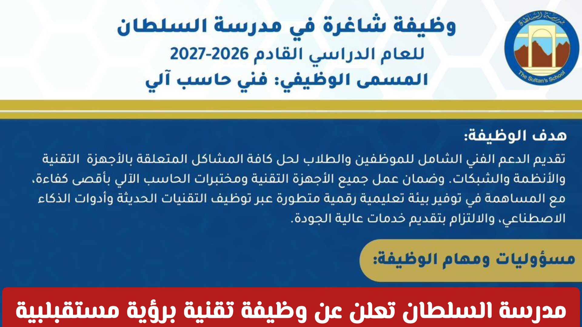 تستهدف مدرسة السلطان استقطاب كوادر عمانية مؤهلة لتقديم الدعم الفني الشامل للطلاب والموظفين. الهدف الأساسي من الوظيفة هو ضمان استمرارية العمل في المختبرات والأنظمة المدرسية بأعلى كفاءة، مع التركيز على توظيف أدوات الذكاء الاصطناعي (AI) لتطوير البيئة التعليمية الرقمية اذذكز بحسب ما تم تداوله على وسائل الإعلام .