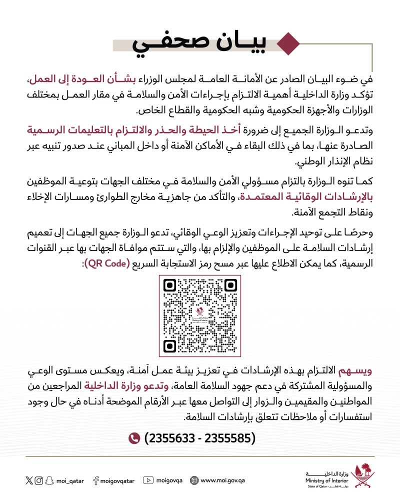 أطلقت وزارة الداخلية القطرية حزمة من التوجيهات الصارمة الهادفة إلى ترسيخ ثقافة "الوقاية أولاً" داخل بيئات العمل. وتأتي هذه الخطوات لضمان جاهزية المنشآت لمواجهة أي تحديات محتملة عبر النقاط التالية كخقفي بحسب ما تم تداوله على وسائل الإعلام :