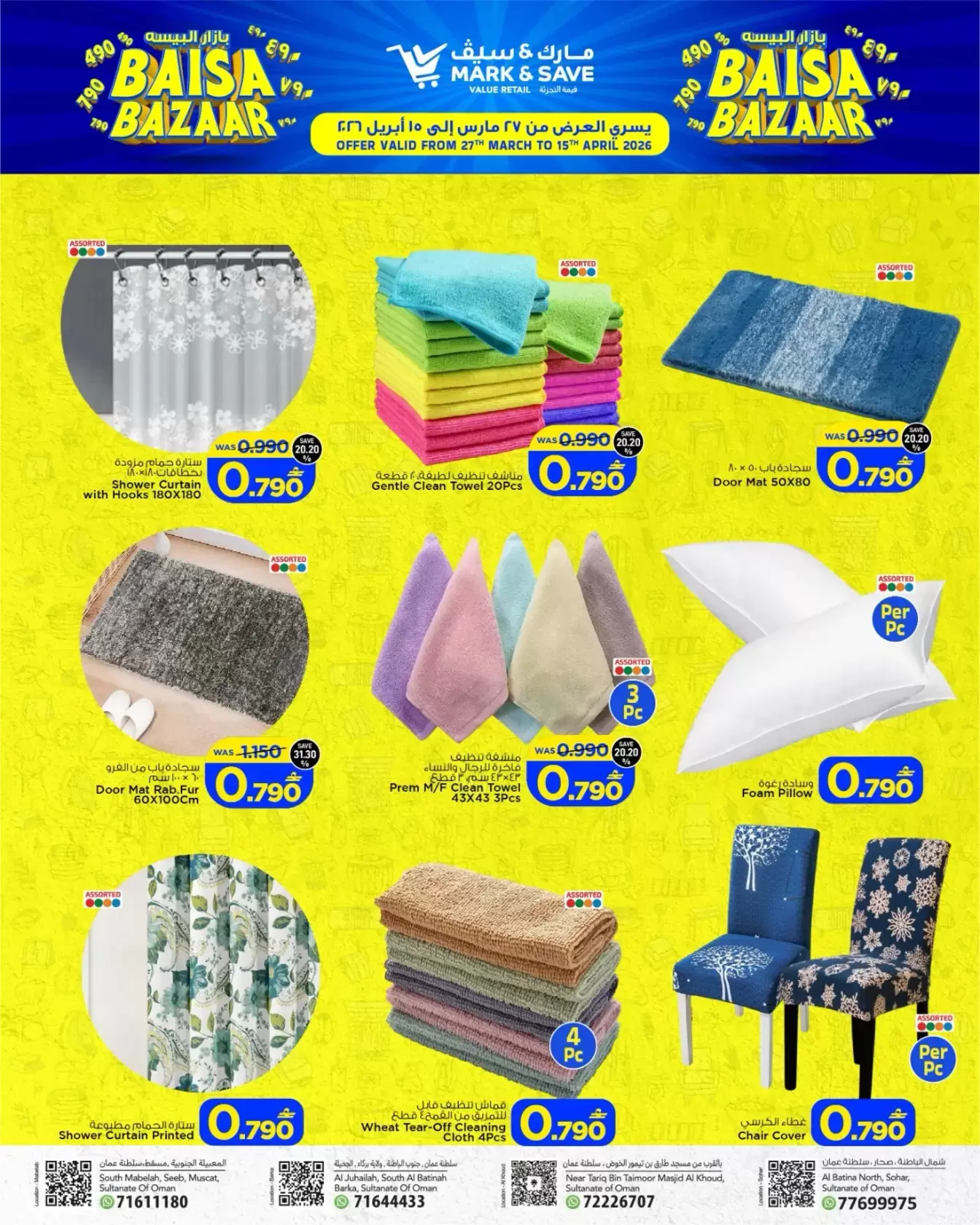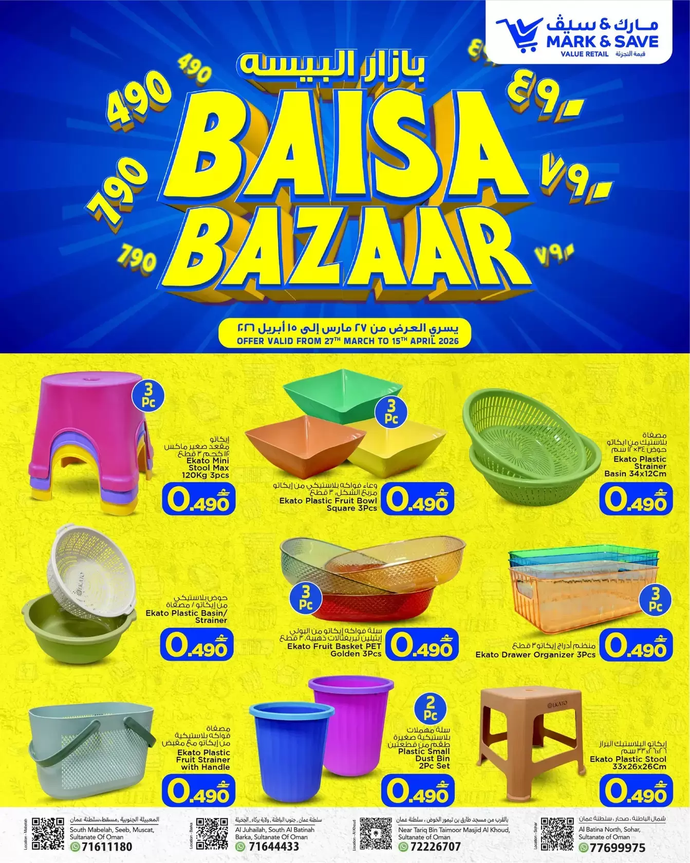 هل تبحث عن أفضل طرق التوفير في سلطنة عمان؟ أطلق متجر مارك آند سيف (Mark & Save) حملته المنتظرة "بازار البيسة" (Baisa Bazaar)، والتي تقدم تشكيلة واسعة من المستلزمات المنزلية، الألعاب، والأدوات القرطاسية بأسعار استثنائية تبدأ من 0 .490 و0.790 ريال عماني فقط.