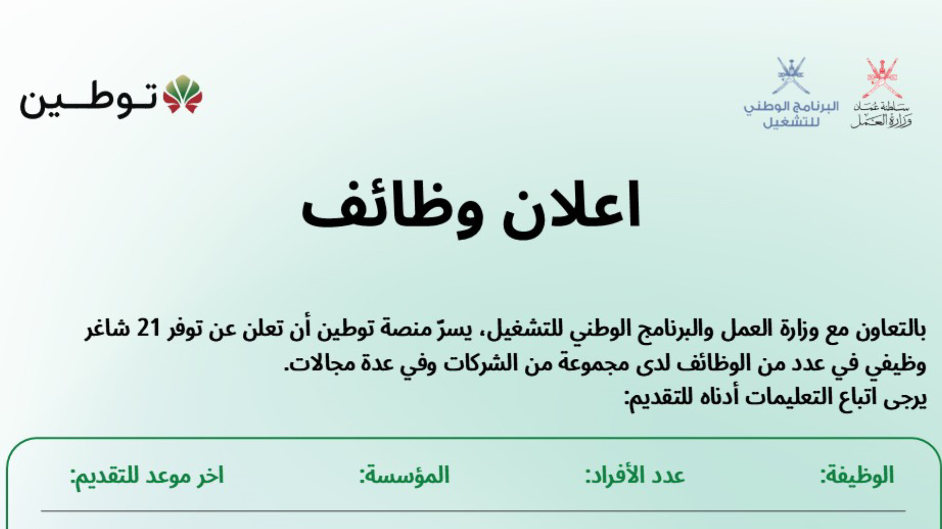 بالتعاون مع وزارة العمل والبرنامج الوطني للتشغيل، يسر منصة توطين أن تعلن عن توفر 21 شاغراً وظيفياً في عدد من الوظائف لدى مجموعة من الشركات وفي عدة مجالات. يرجى اتباع التعليمات أدناه للتقديم:
