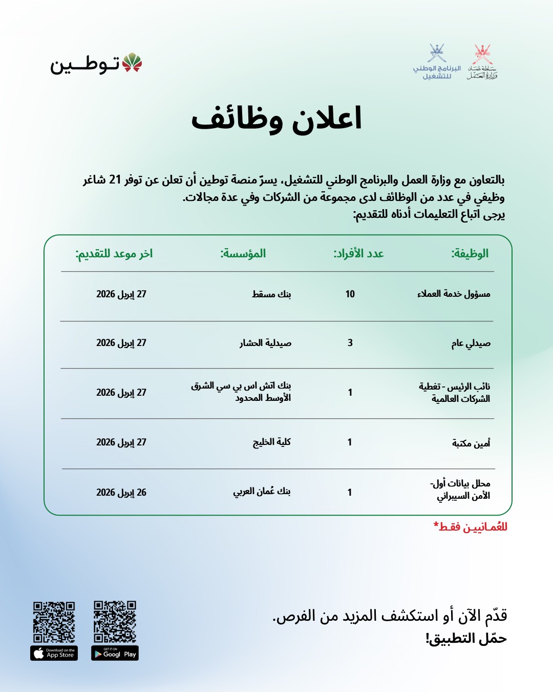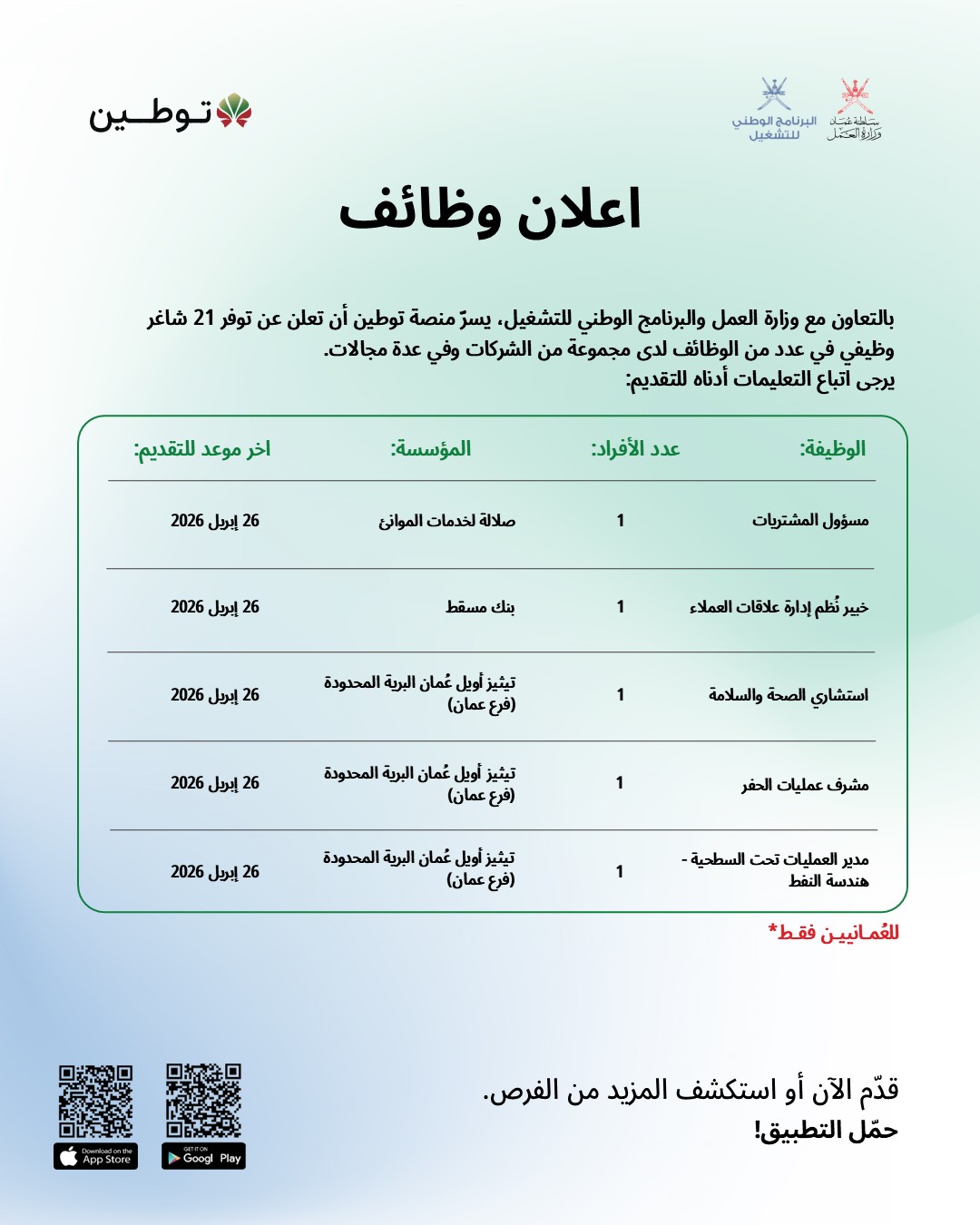 | استشاري الصحة والسلامة | 1 | تيثيز أويل عُمان البرية المحدودة (فرع عُمان) | 26 أبريل 2026 |