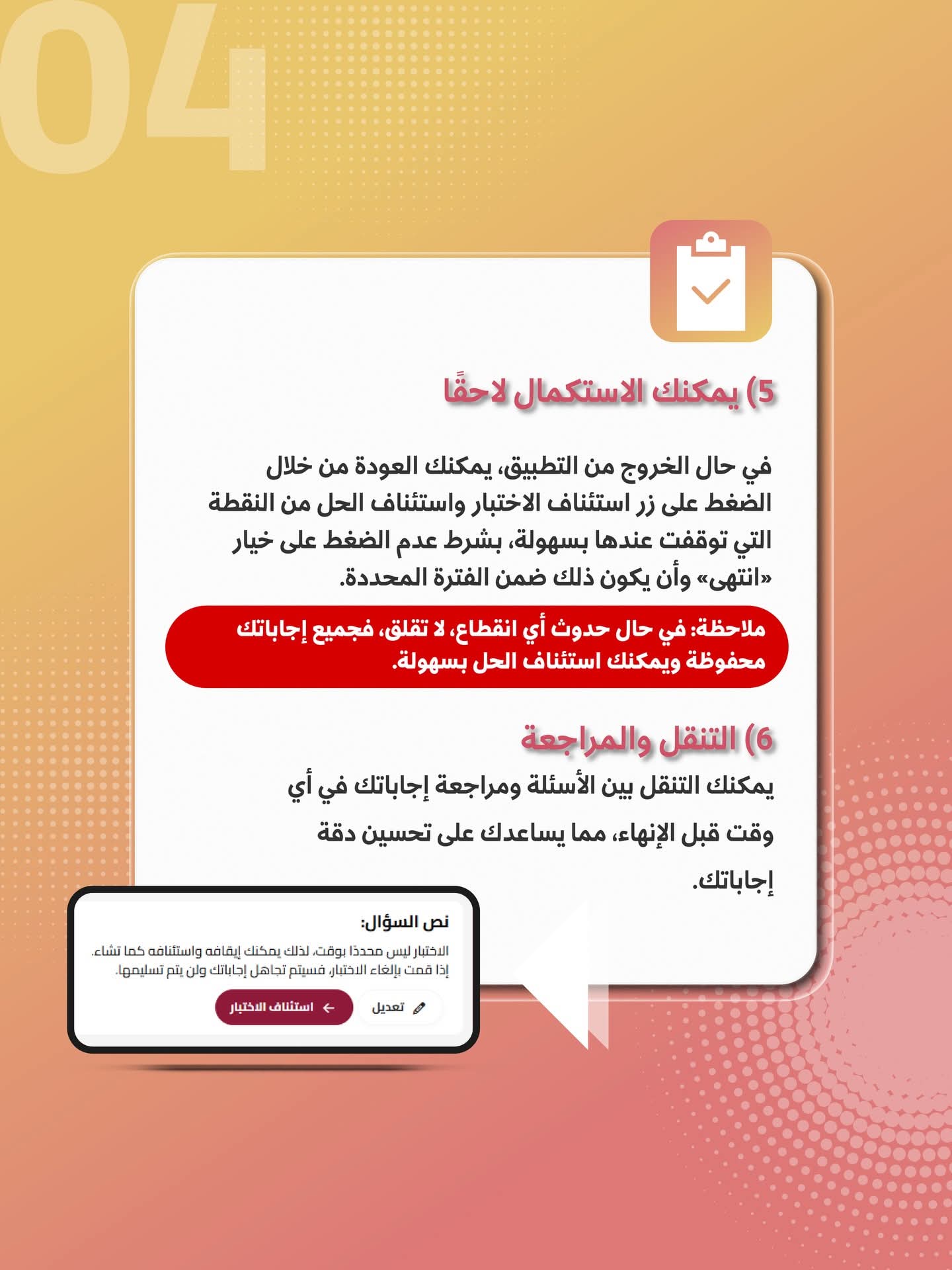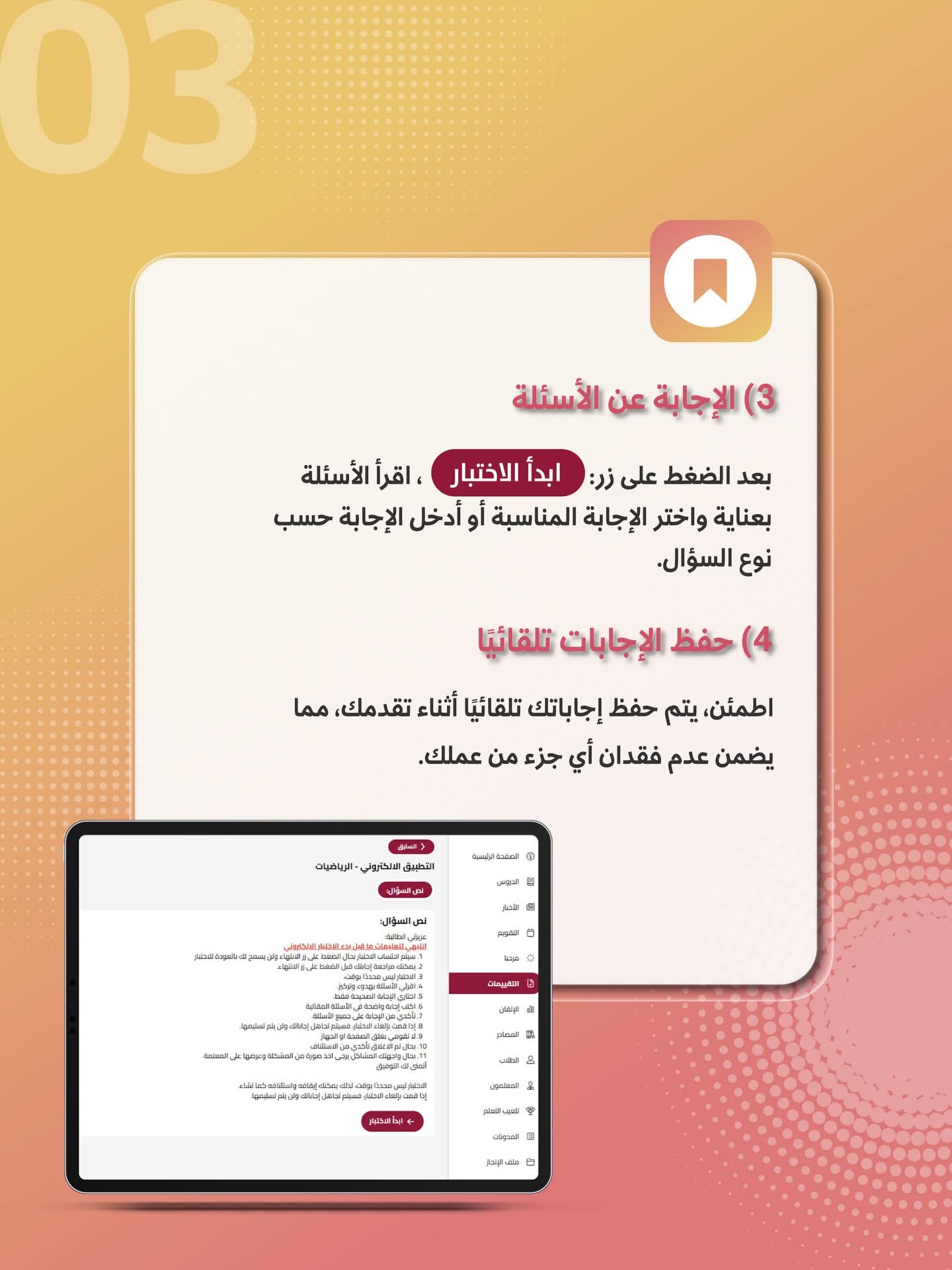 من أهم مميزات نظام قطر للتعليم هي خاصية التخزين الآمن؛ حيث يتم حفظ كل إجابة تدخلها بشكل فوري ومنتظم، مما يحميك من ضياع مجهودك في حال حدوث أي طارئ تقني.