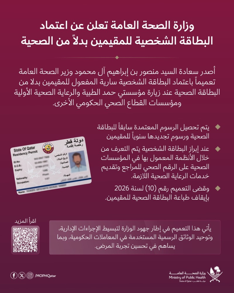 بموجب التعميم رقم 10 لسنة 2026 الصادر عن سعادة السيد منصور بن إبراهيم آل محمود، وزير الصحة العامة، أصبح لزاماً على كافة المؤسسات الصحية الحكومية، وعلى رأسها مؤسسة حمد الطبية ومؤسسة الرعاية الصحية الأولية، قبول البطاقة الشخصية القطرية (سارية المفعول) كوثيقة وحيدة ورئيسية لإثبات الهوية الصحية للمقيمين. يهدف هذا القرار بشكل أساسي إلى ظاهلر بحسب ما تم تداوله على وسائل الإعلام :