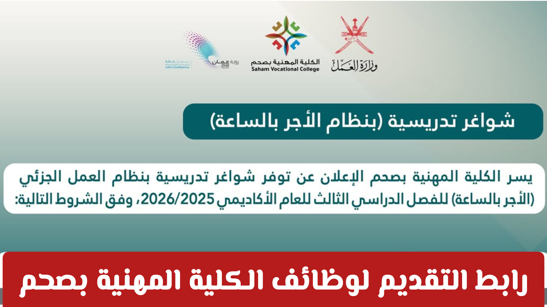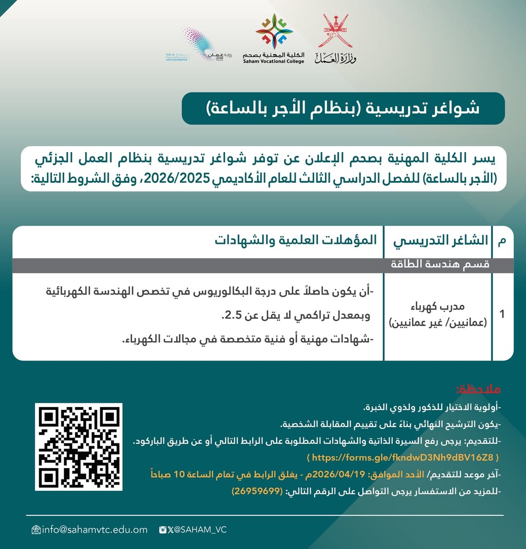 تستمر سلطنة عمان في تعزيز كوادرها التعليمية والمهنية بفرص واعدة، حيث أعلنت الكلية المهنية بصحم، التابعة لوزارة العمل، عن فتح باب التسجيل لشغل وظائف تدريسية شاغرة بنظام الأجر بالساعة للفصل الدراسي الثالث من العام الأكاديمي 2025/2026 . وتأتي هذه الخطوة لتلبية احتياجات قسم هندسة الطاقة ورفد القطاع المهني بخبرات متخصصة.
