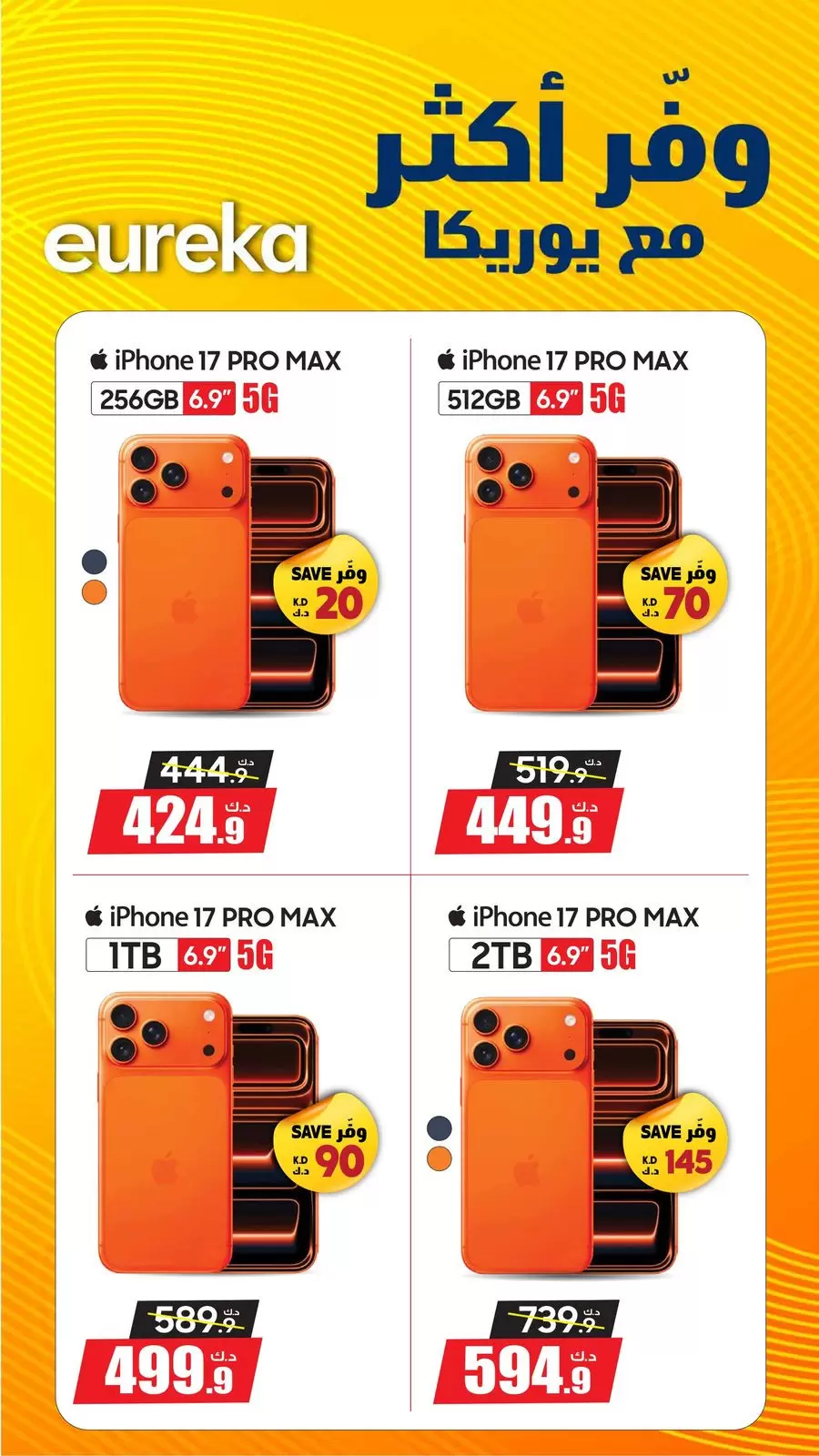 | iPhone 17 Pro Max | 2TB | 739.9 د.ك | 594.9 د.ك | 145 د.ك |