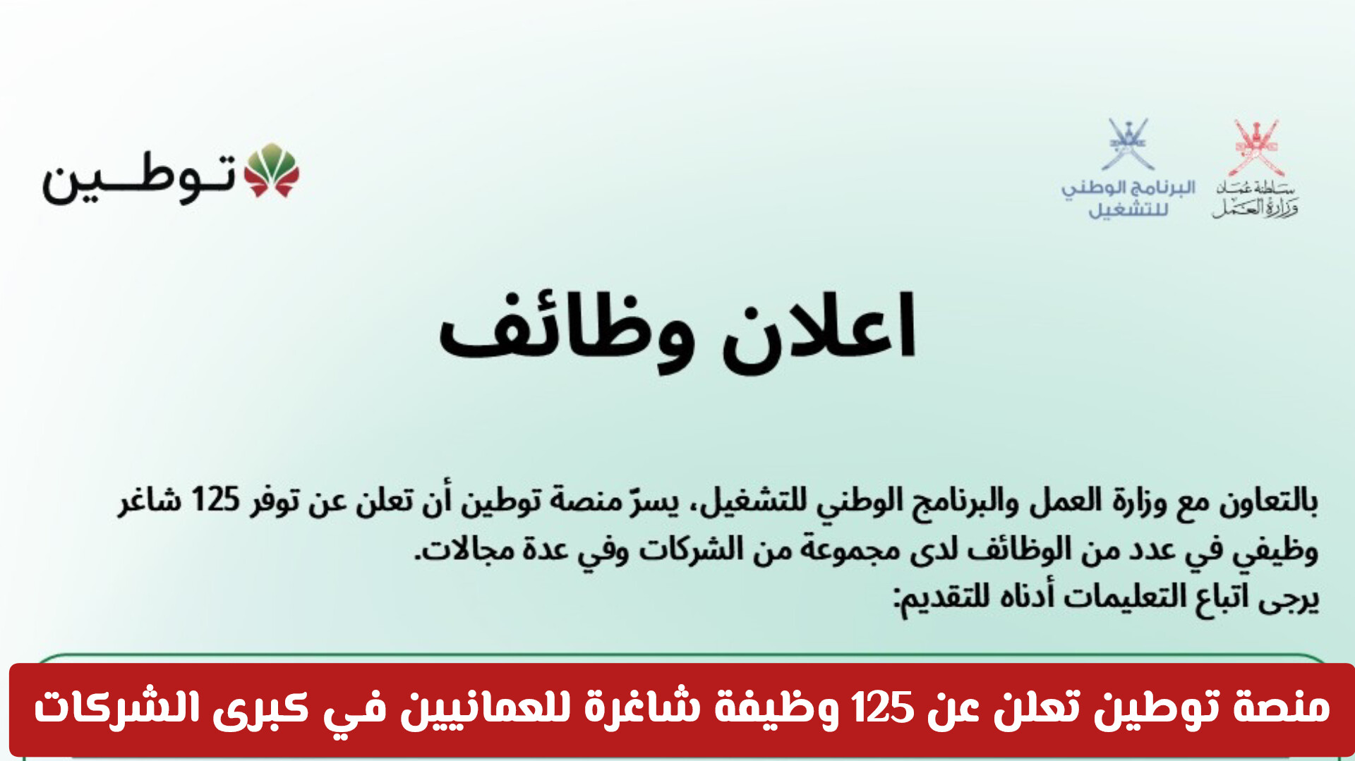 في إطار السعي المستمر لتمكين الكوادر الوطنية، أعلنت منصة "توطين"، بالتعاون مع وزارة العمل والبرنامج الوطني للتشغيل في سلطنة عمان، عن توفر 125 شاغراً وظيفياً لدى مجموعة من كبرى المؤسسات والشركات في القطاعين الخاص والمصرفي .