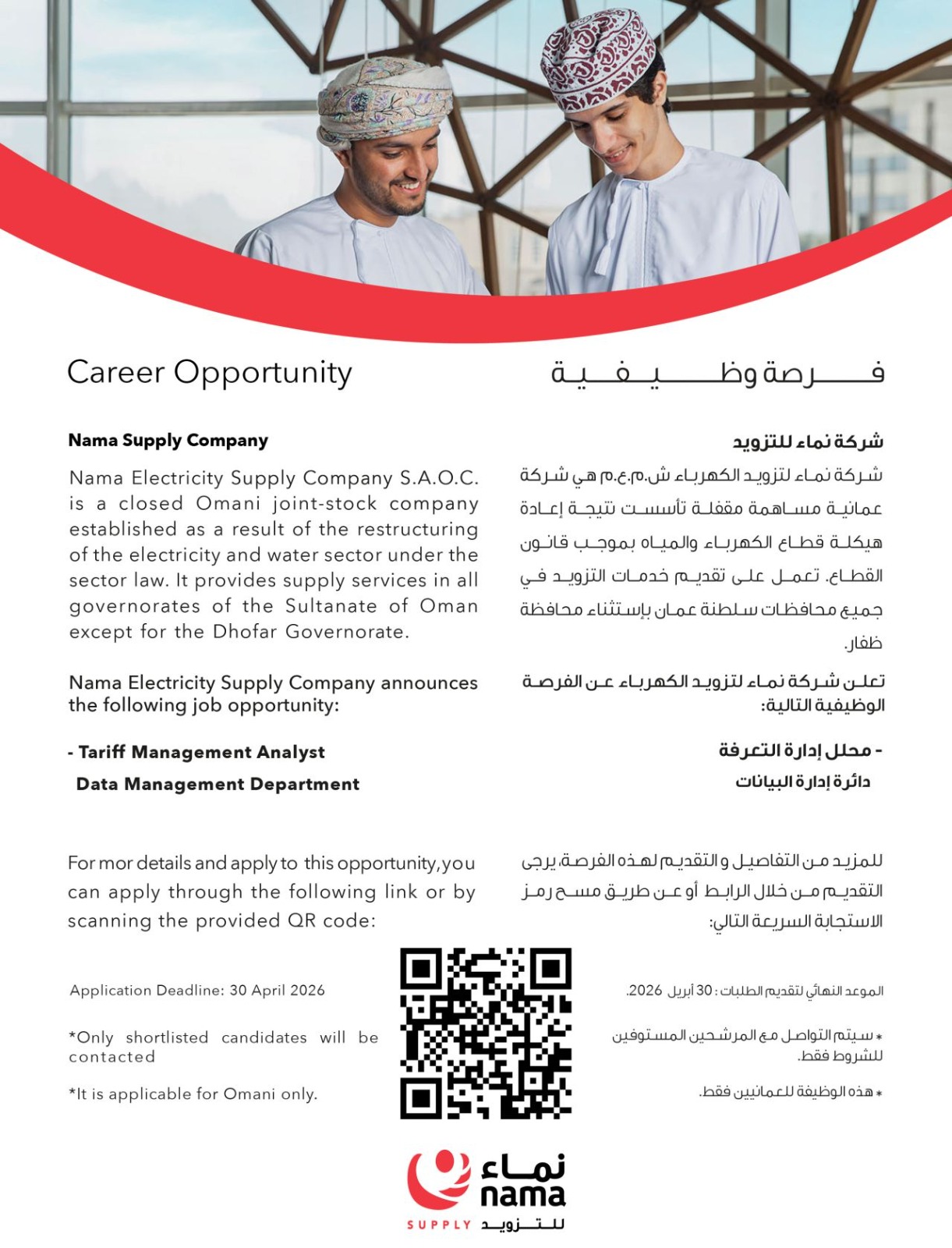 هل تبحث عن انطلاقة مهنية قوية في قطاع الطاقة بسلطنة عمان؟ أعلنت شركة نماء لتزويد الكهرباء (Nama Supply)، الرائدة في تقديم خدمات الكهرباء والمياه، عن فتح باب التوظيف للعمانيين الطموحين للانضمام إلى فريقها المتخصص .