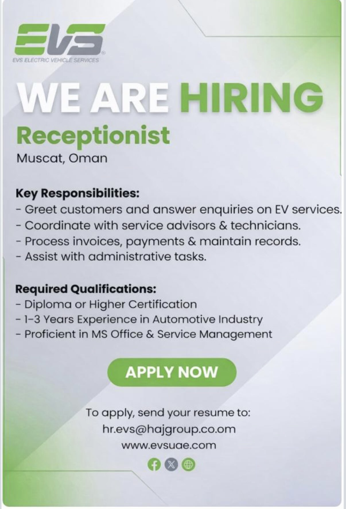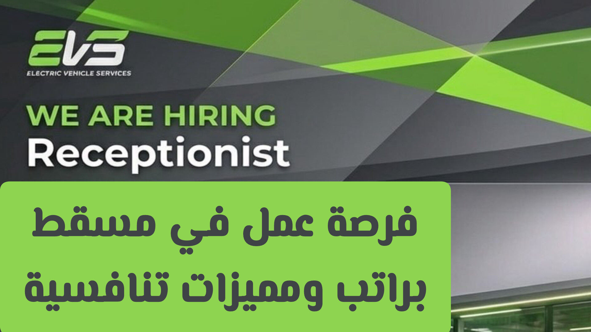 هل تبحث عن انطلاقة مهنية جديدة في قطاع السيارات الكهربائية المتنامي؟ أعلنت شركة EVS (Electric Vehicle Services)، الرائدة في خدمات المركبات الكهربائية، عن توفر شاغر وظيفي لمنصب موظف استقبال (Receptionist) في فرعها بمدينة مسقط، سلطنة عمان .