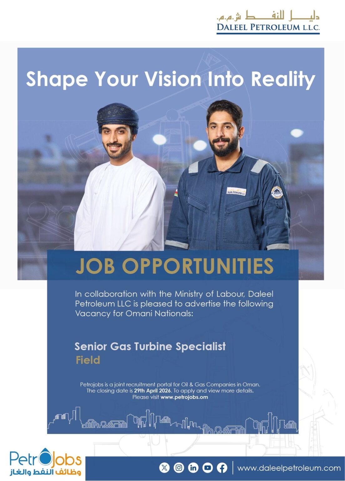 إذا كنت تجد في نفسك الكفاءة والشروط المطلوبة وترغب في الانضمام إلى صرح اقتصادي رائد يساهم في بناء مستقبل عمان، يمكنك تقديم طلبك الآن والالتحاق بـ وظائف شركة دليل للنفط عبر المنصة الرسمية لتوظيف قطاع النفط والغاز "Petrojobs" من خلال الرابط التالي: