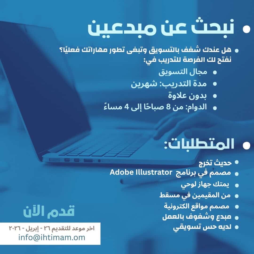 هل أنت خريج جديد وتبحث عن انطلاقة حقيقية لمسيرتك المهنية؟ هل تمتلك شغفاً بالتسويق ومهارات في التصميم الإبداعي؟ تعلن إحدى الجهات الرائدة في سلطنة عمان (مسقط) عن فتح باب التسجيل لفرصة تدريبية استثنائية تستهدف العقول المبدعة التي ترغب في تحويل شغفها إلى مهارات احترافية على أرض الواقع .