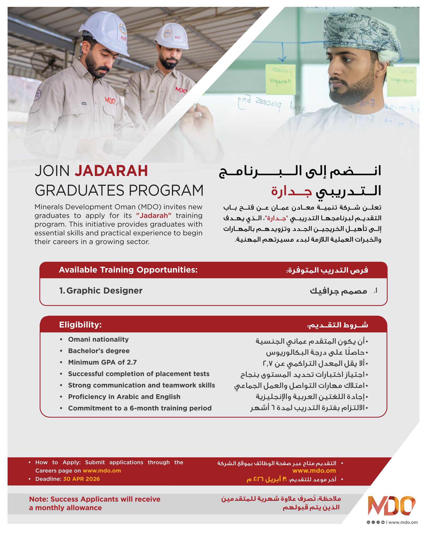 تُعد سلطنة عمان وجهة رائدة للاستثمار في قطاع التعدين، وفي إطار دعم الكوادر الوطنية الشابة، أعلنت شركة تنمية معادن عمان (MDO) عن فتح باب التسجيل في برنامج "جدارة" للتدريب المقرون بالتشغيل لعام 2026 . يهدف هذا البرنامج إلى صقل مهارات الخريجين الجدد وتزويدهم بالخبرات العملية اللازمة لدخول سوق العمل بقوة في قطاع حيوي ومتنامٍ.
