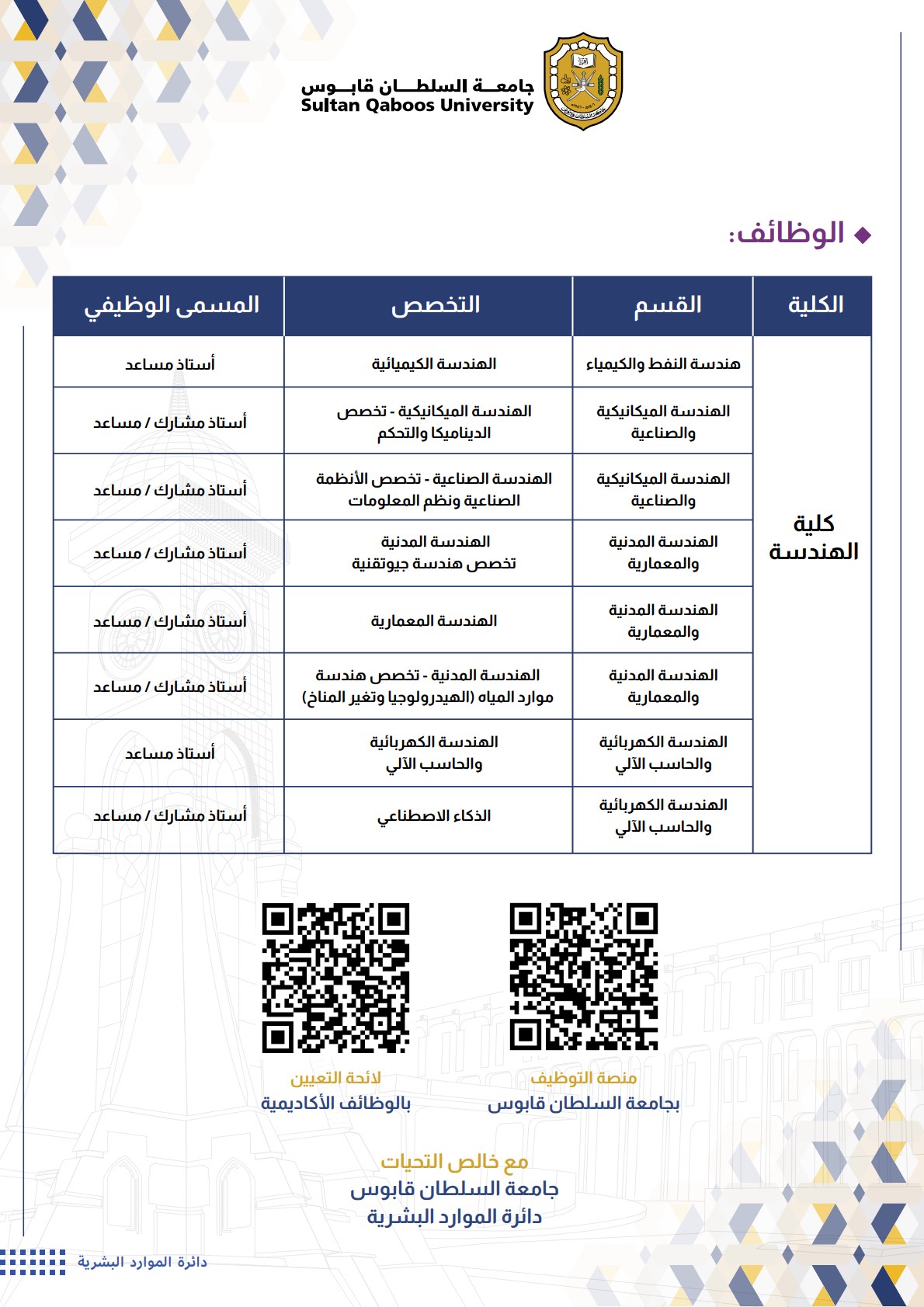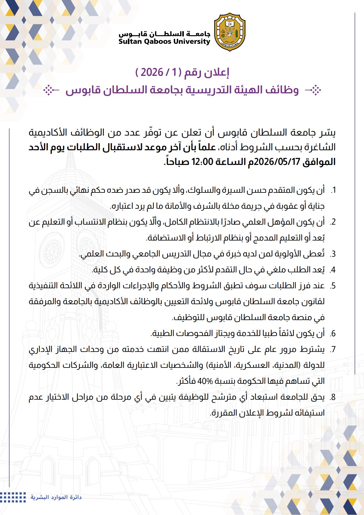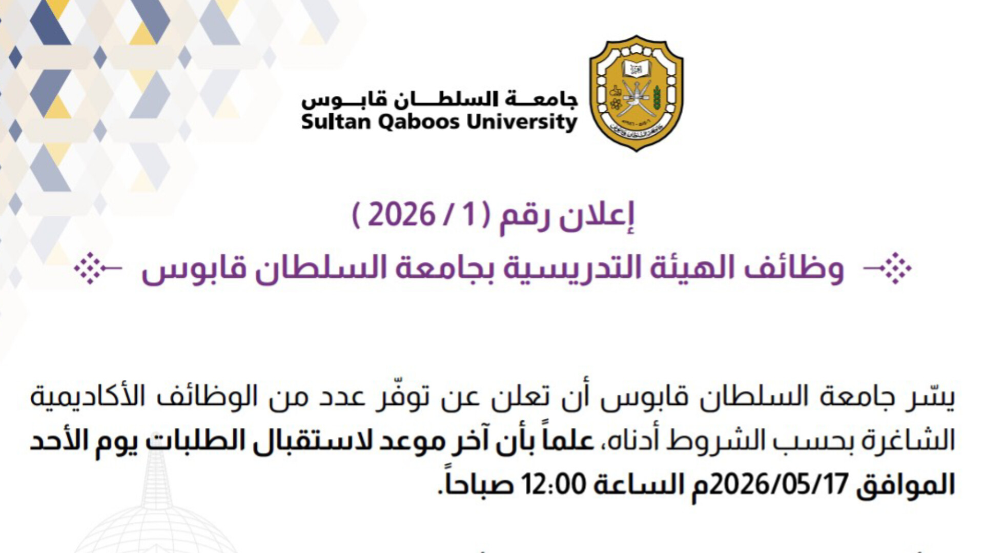 بناءً على الإعلان الصادر من دائرة الموارد البشرية، يسر جامعة السلطان قابوس أن تعلن عن توفر عدد من الوظائف الأكاديمية الشاغرة حسب الشروط أدناه، علماً بأن آخر موعد لاستقبال الطلبات يوم الأحد الموافق 2026/05/17م الساعة 12:00 صباحاً: