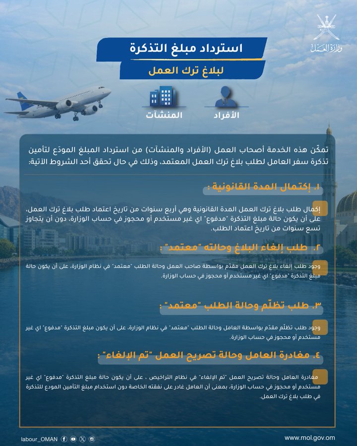 تسعى وزارة العمل في سلطنة عمان بشكل مستمر إلى تنظيم العلاقة التعاقدية بين صاحب العمل والعامل بما يضمن حقوق الطرفين . ومن أبرز التسهيلات التي قدمتها الوزارة مؤخراً هي خدمة "استرداد مبلغ التذكرة لبلاغ ترك العمل"، والتي تتيح للمنشآت والأفراد استرجاع المبالغ المودعة لتأمين سفر العمال في حالات محددة.