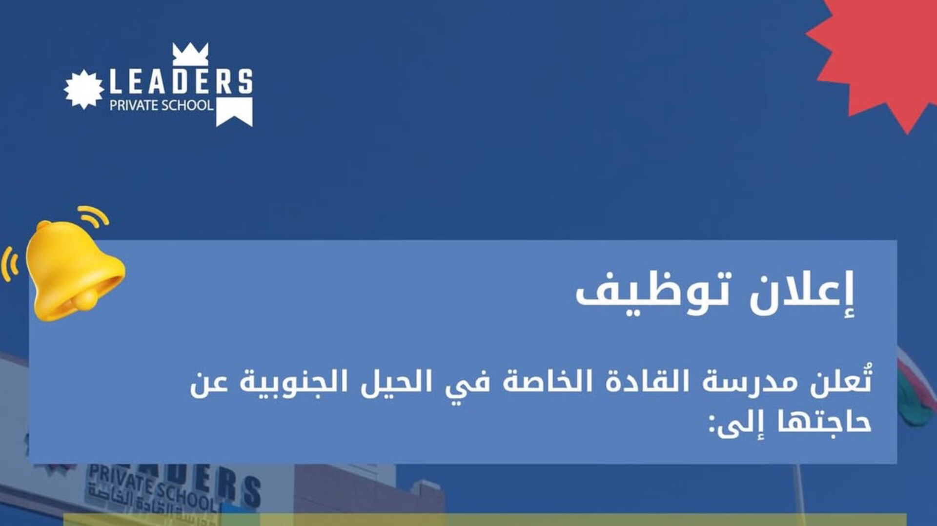 تستمر سلطنة عمان في تعزيز قطاعها التعليمي عبر استقطاب الكفاءات الوطنية الشابة، وفي هذا السياق، أعلنت مدرسة القادة الخاصة (Leaders Private School) في منطقة الحيل الجنوبية بمحافظة مسقط عن توفر فرص وظيفية تعليمية جديدة للعمانيات الطموحات الراغبات في الانضمام إلى بيئة تعليمية متميزة .