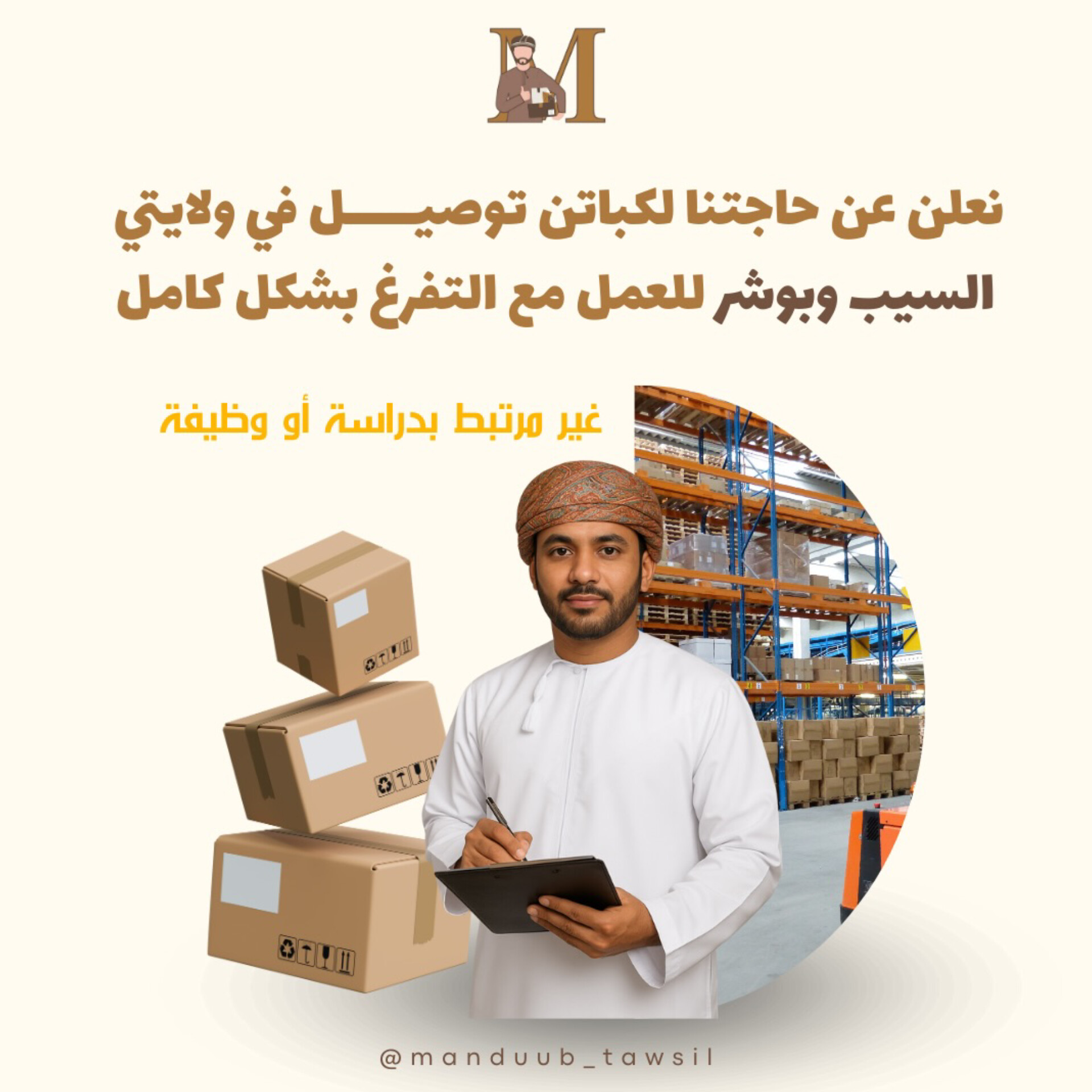 هل تبحث عن وظائف توصيل في سلطنة عمان؟ هل تسكن في ولايتي السيب أو بوشر وتبحث عن دخل يومي مستمر وعمل حر يضمن لك الاستقلالية؟ يعلن حساب manduub_tawsil عن فتح باب التوظيف لعدد من "كباتن التوصيل" بنظام التفرغ الكامل، للانضمام إلى واحدة من أسرع شبكات التوصيل نمواً في المنطقة . في هذا المقال، نستعرض معكم كافة التفاصيل المتعلقة بالشروط، المميزات، وطريقة التقديم لهذه الفرصة المجزية.