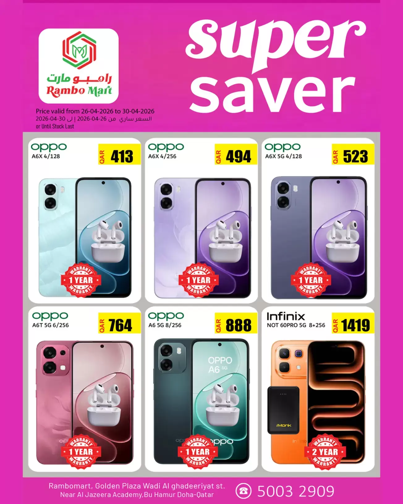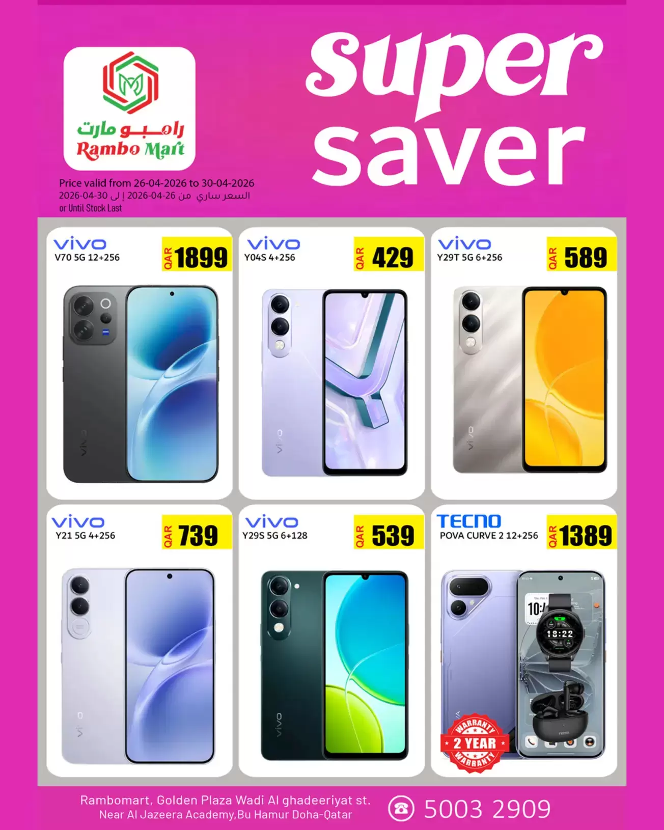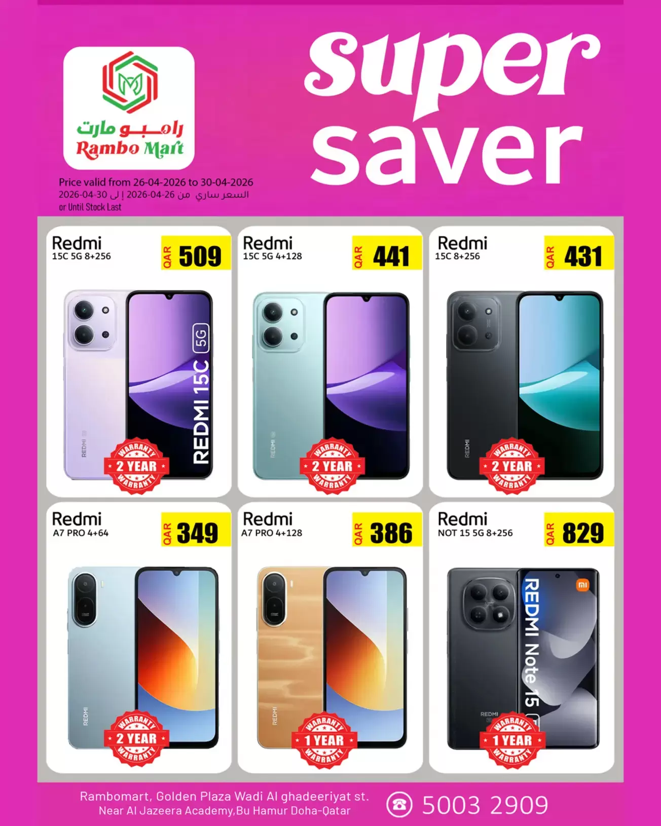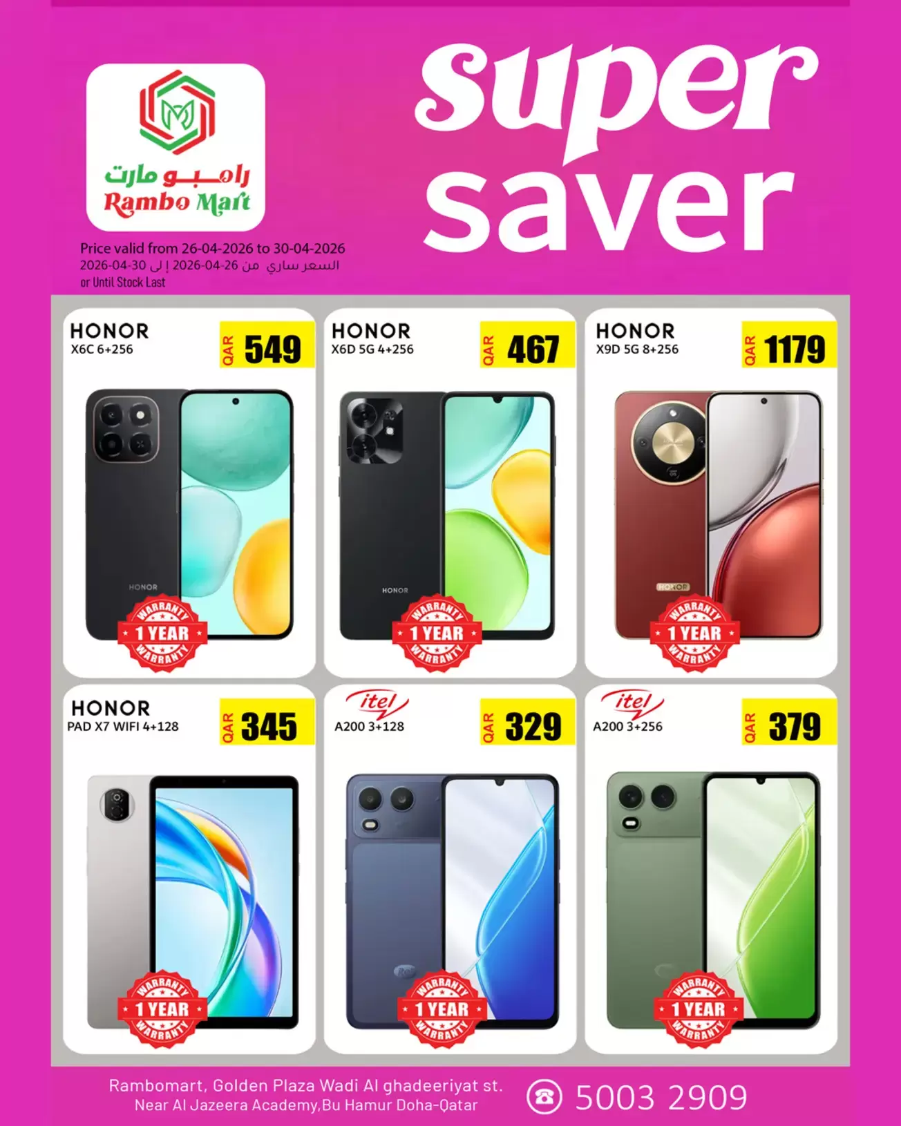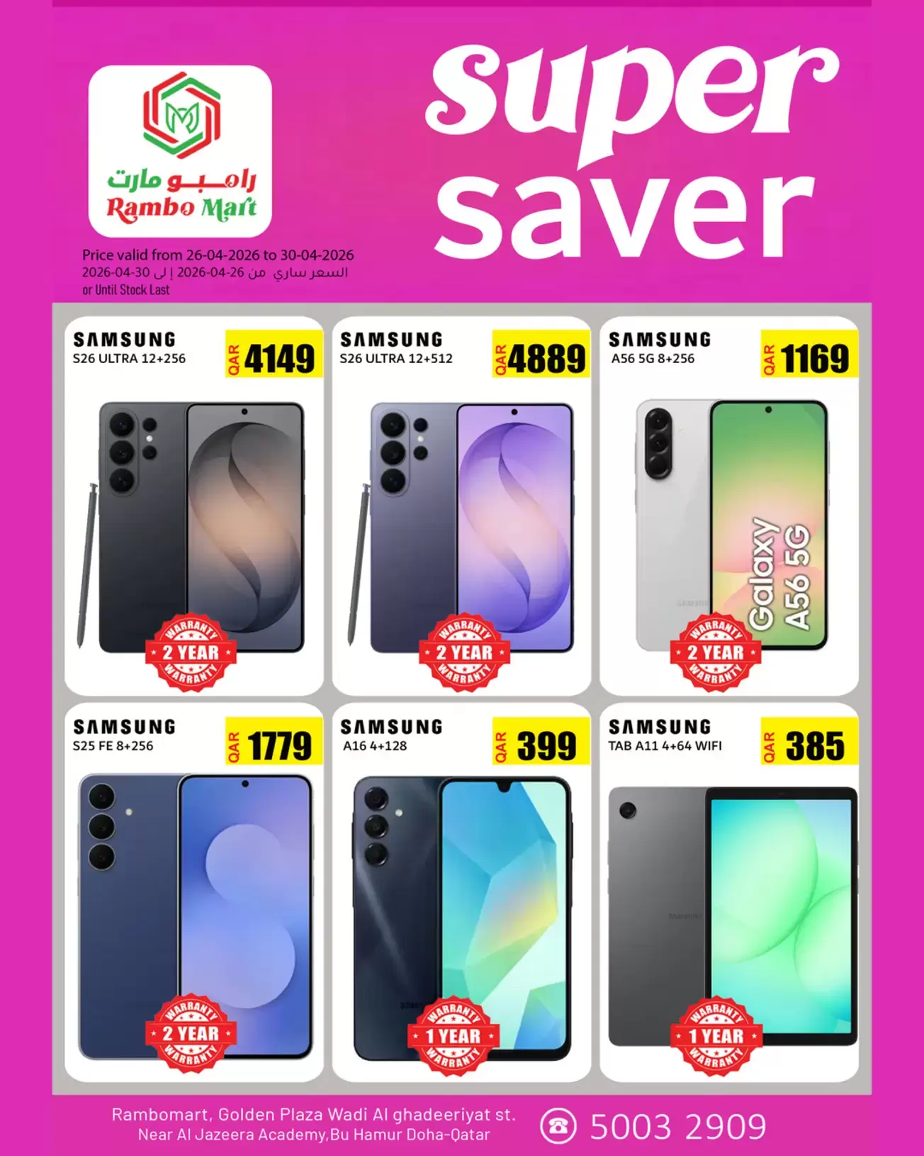 ملاحظة هامة: العروض سارية من 26-04-2026 إلى 30-04-2026 أو حتى نفاذ الكمية في فروع رامبو مارت - جولدن بلازا، شارع وادي الغديريات، بالقرب من أكاديمية الجزيرة، بو هامور، الدوحة صصفبذ بحسب ما تم تداوله على وسائل الإعلام .