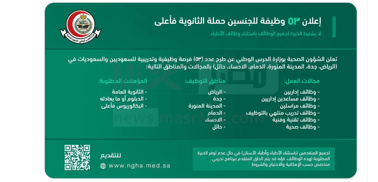 الشؤون الصحية في وزارة الحرس الوطني السعودي أعلنت عن توفر مجموعة من الشواغر الوظيفية وذلك لحملة مؤهل الثانوية العامة فأعلى في مجموعة مجالات مختلفة، حيث أن الوظائف متاحة للجنسين، وتقوم غالبا وزارة الشؤون الصحية بالإعلان عن جميع الوظائف سواء منها الإدارية أو التقنية أو االصحية، وباب التقديم يتم فتحه فور الإعلان عن الوظائف وبعد الانتهاء من الأعداد المطلوبة يتم غلق باب التقديم، وسوف نعرفكم في هذه المقال على مسميات الوظائف المطلوبة وشروط ورابط التقديم عليها في موقع وزارة الحرس الوطني